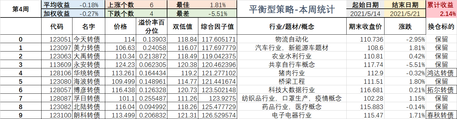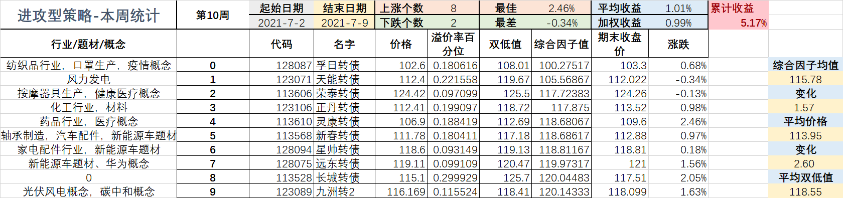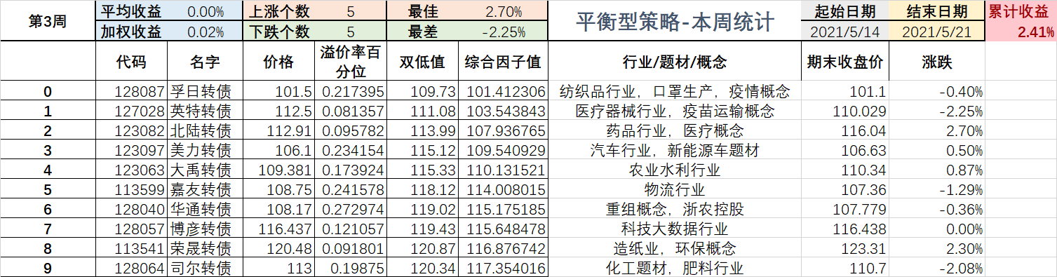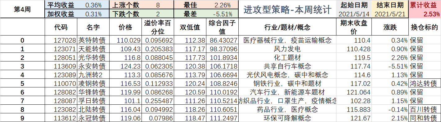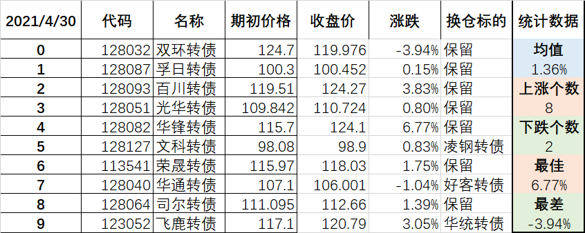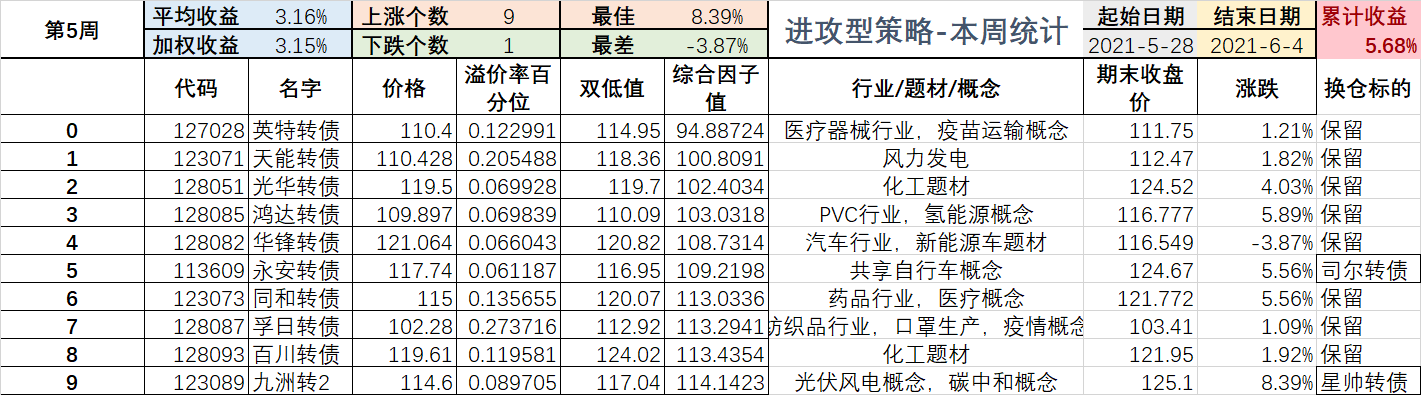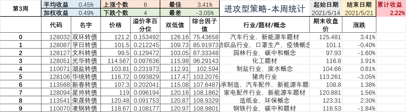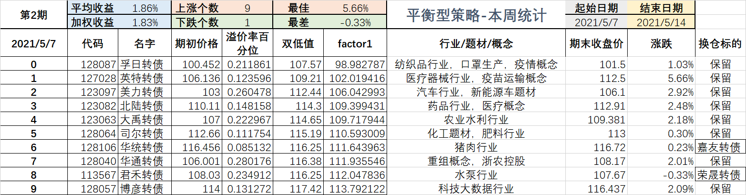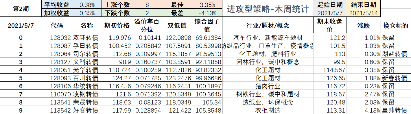 上期平均收益0.45%,加权收益0.49%;其中表现最佳的双环转债上涨3.41%,