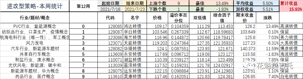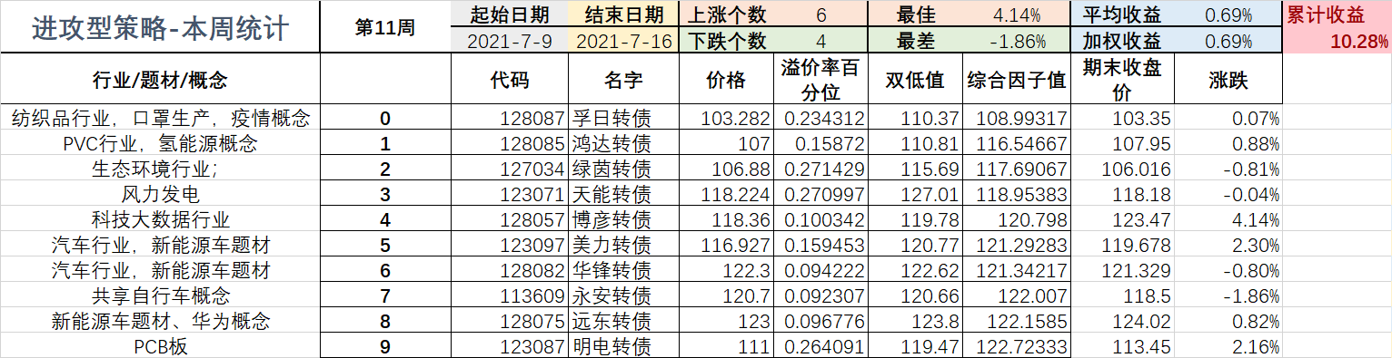 进攻型量化策略主要关注时空修正的溢价率因子(点击查看说明),同时考虑因子有:价格、成交量、转债占比、剩余规模和一些技术指标。回测显示预期年化30%+,最大回撤12%,是高风险高回报策略。注意: