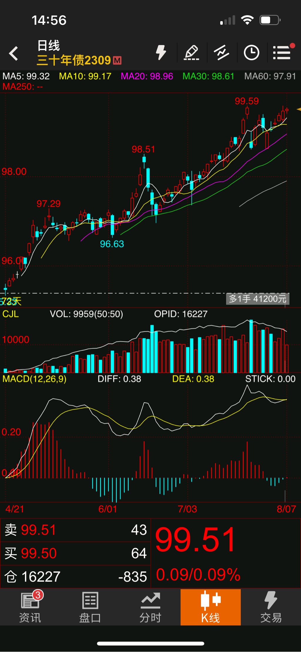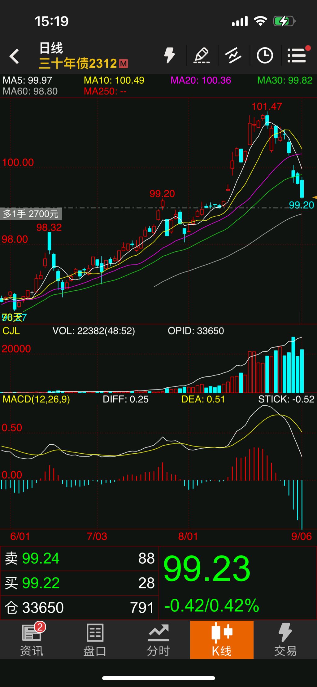 三十年期国债期货的波动会非常大,我做贴水的底仓会继续做下去,现在股债跷跷板,等股指期权多赚点钱会加仓国债期货。现在暂时观望。