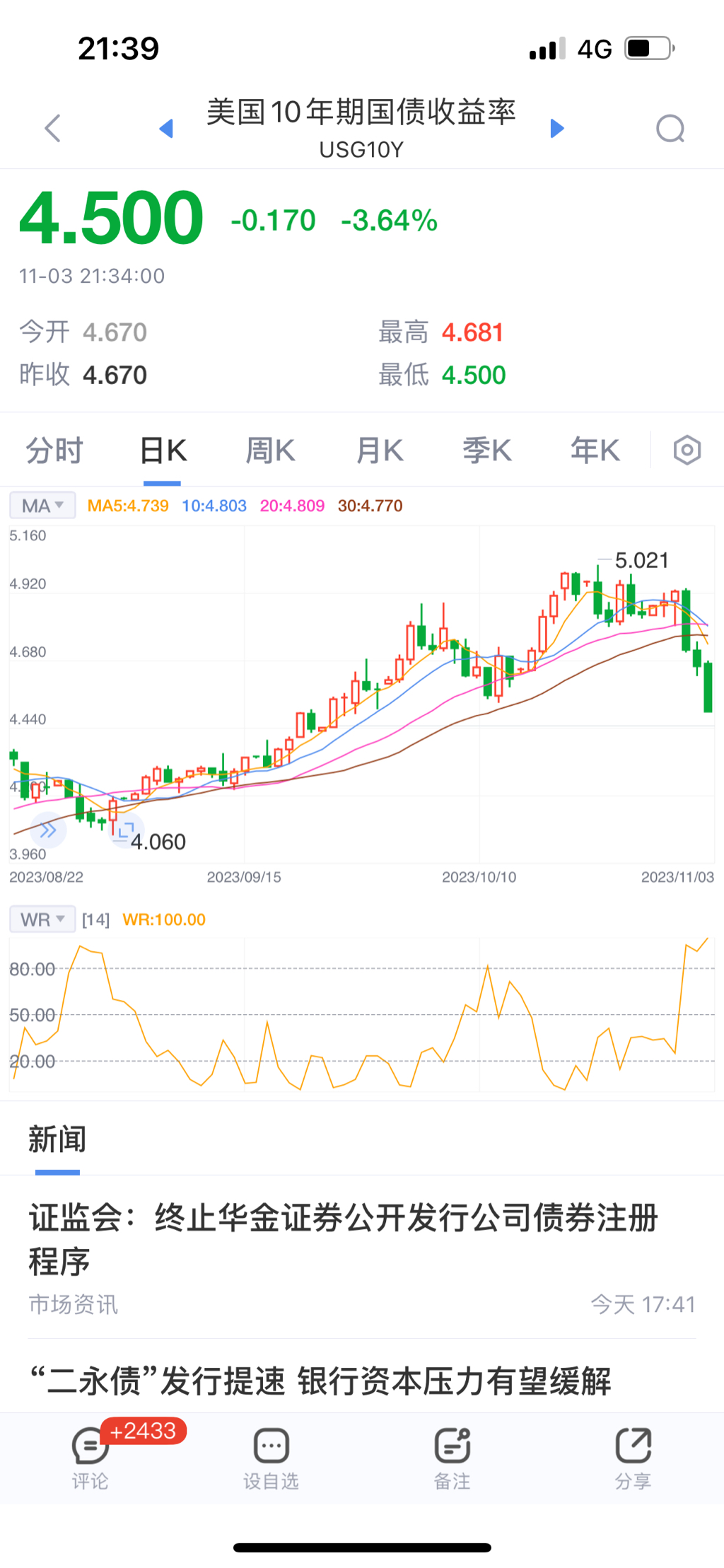 这是移仓价差最小的一次,最近移仓价差一直在缩小,上周还有0.2左右的移仓价差。本周主力合约将切换,不等了。观察一下会不会出现移仓负价差的情况,我的理解是随着市场认为明年美国将进入降息周期,我们还有继续降息的余地,机构做空对冲国债的需求较小,所以移仓贴水很少。最近几个月债券市场波动比较大,美债对全球市场的影响很大。现十年期国债收益率2.676%,十年期美债收益率4.459%,本轮加息周期十年期美债收益率最高冲到5.021%后回落,对全球市场造成冲击,是上证指数跌破3000点的关键因素。