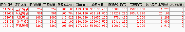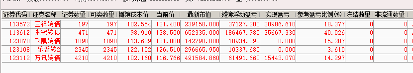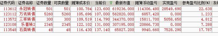 有一段时间没更新了,近期盈利总额创新高,主要是永冠转债、万讯转债走势良好,近期小幅减仓一点,飞凯转债表现尚可,石英转债算是卖飞了,乐普转债有点尴尬。。。