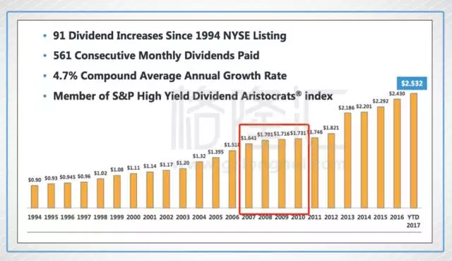 下图是著名的reits Reality Income(O)的走势和分红柱状图。过去二十五年,年化收益16%左右,大幅跑赢标普。每月分红,1994年上市以来90多次提高分红。