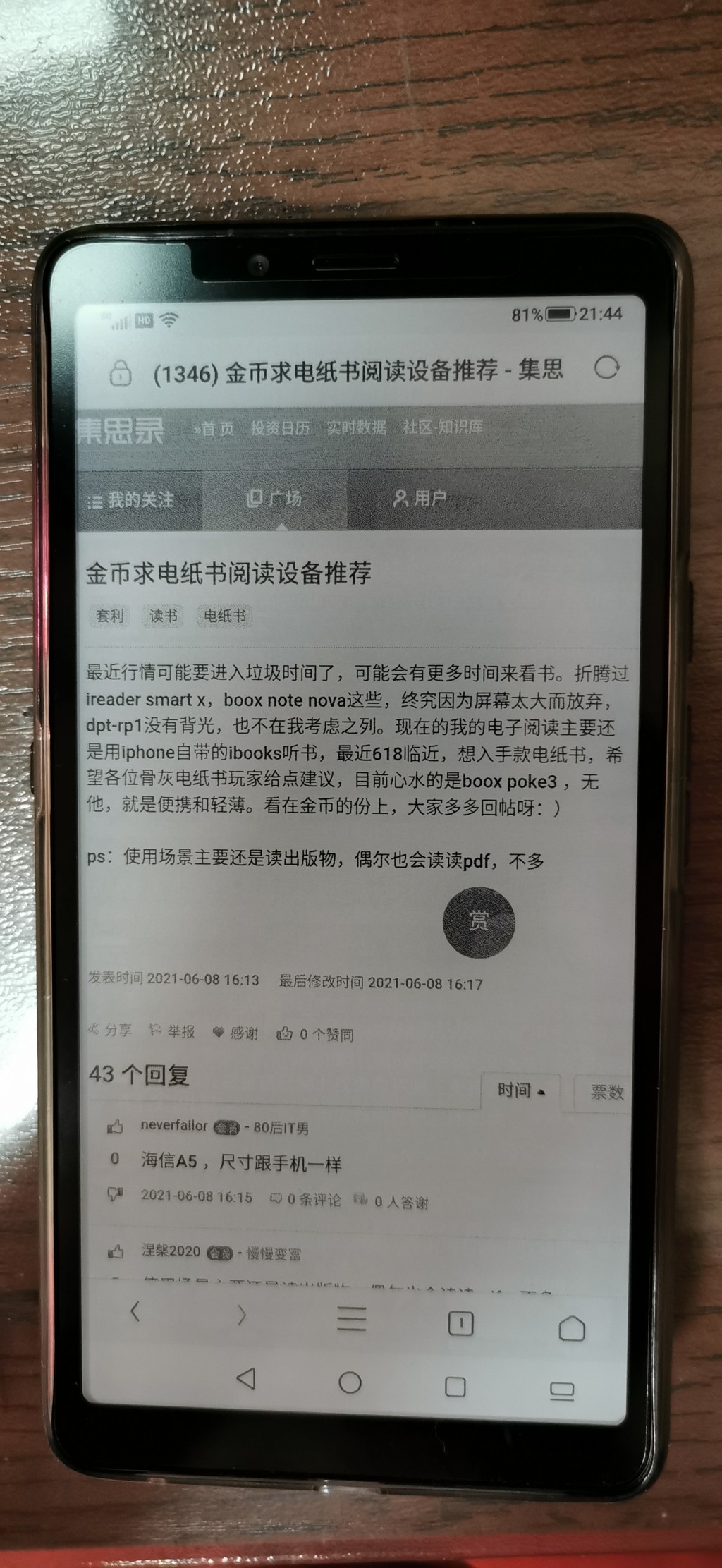 kindle以前用的多,现在主要用文石book,可以安装集思录刷集思录帖子,可以手机截屏经典回帖转成PDF在Book里看。