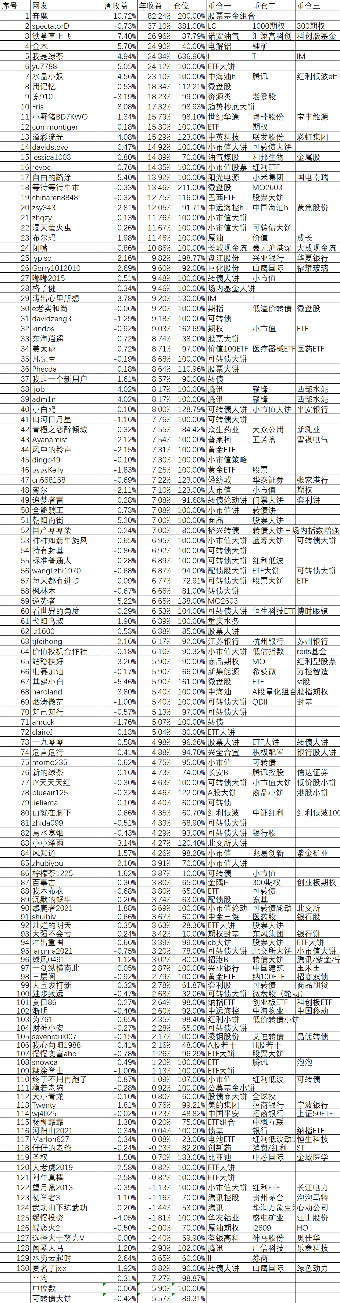 周收益 年收益 仓位 重仓一 重仓二 重仓三