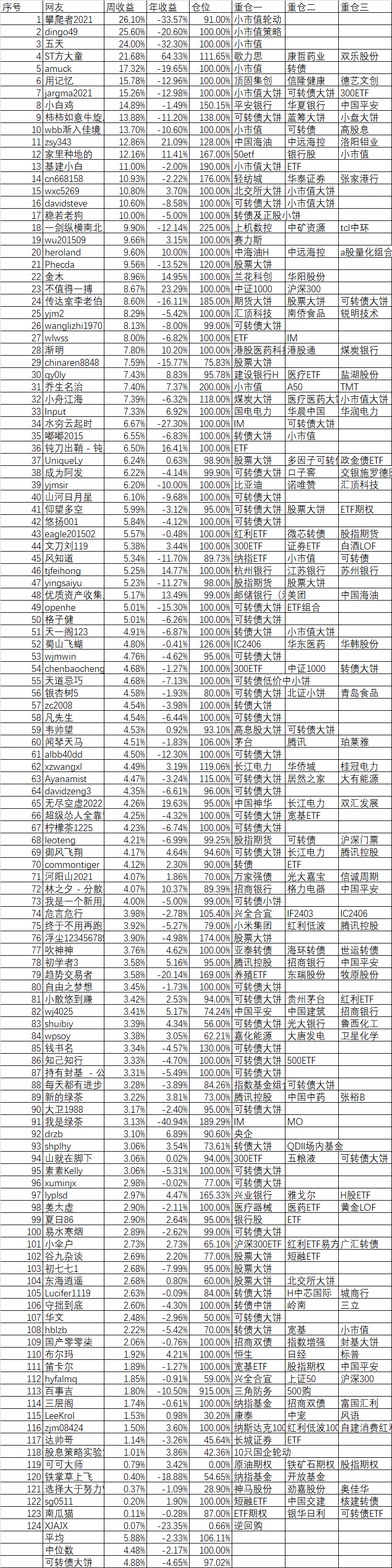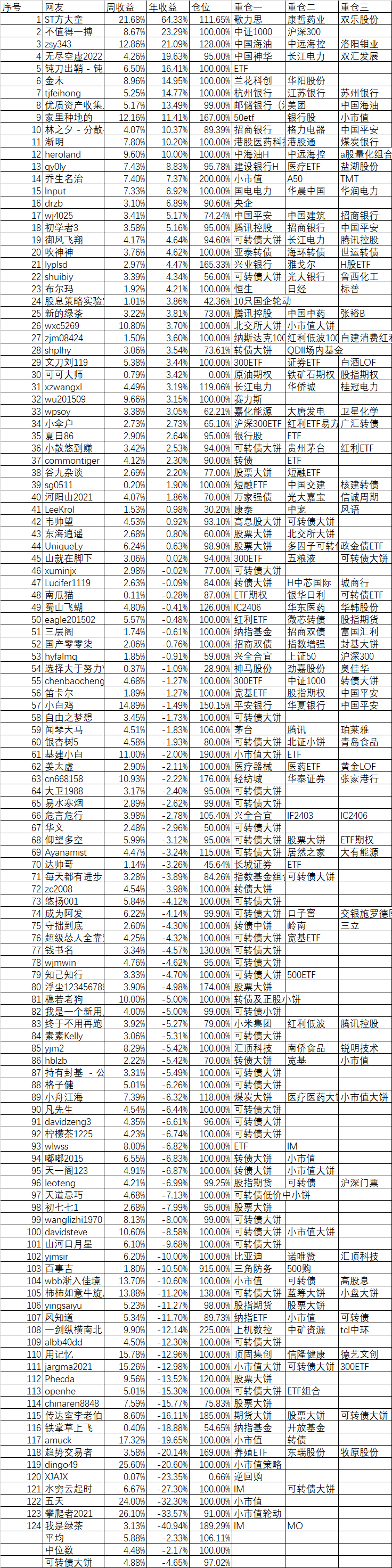 周收益 年收益 仓位 重仓一 重仓二 重仓三