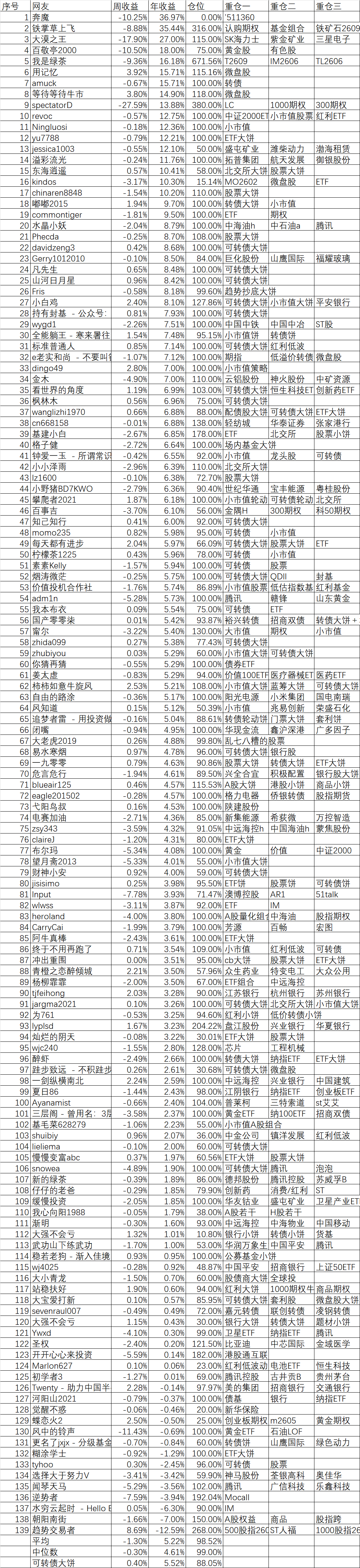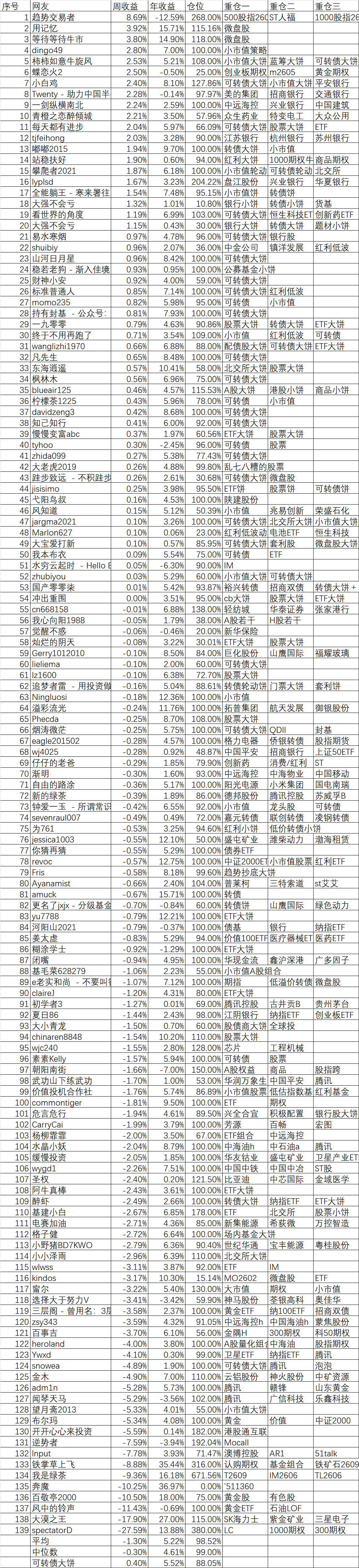 周收益 年收益 仓位 重仓一 重仓二 重仓三