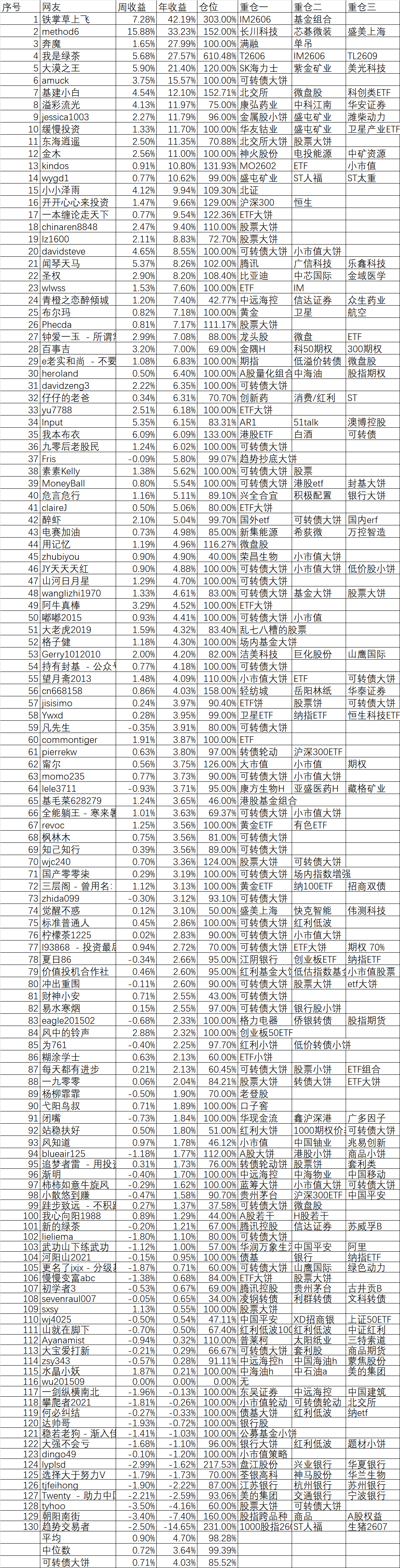 周收益 年收益 仓位 重仓一 重仓二 重仓三