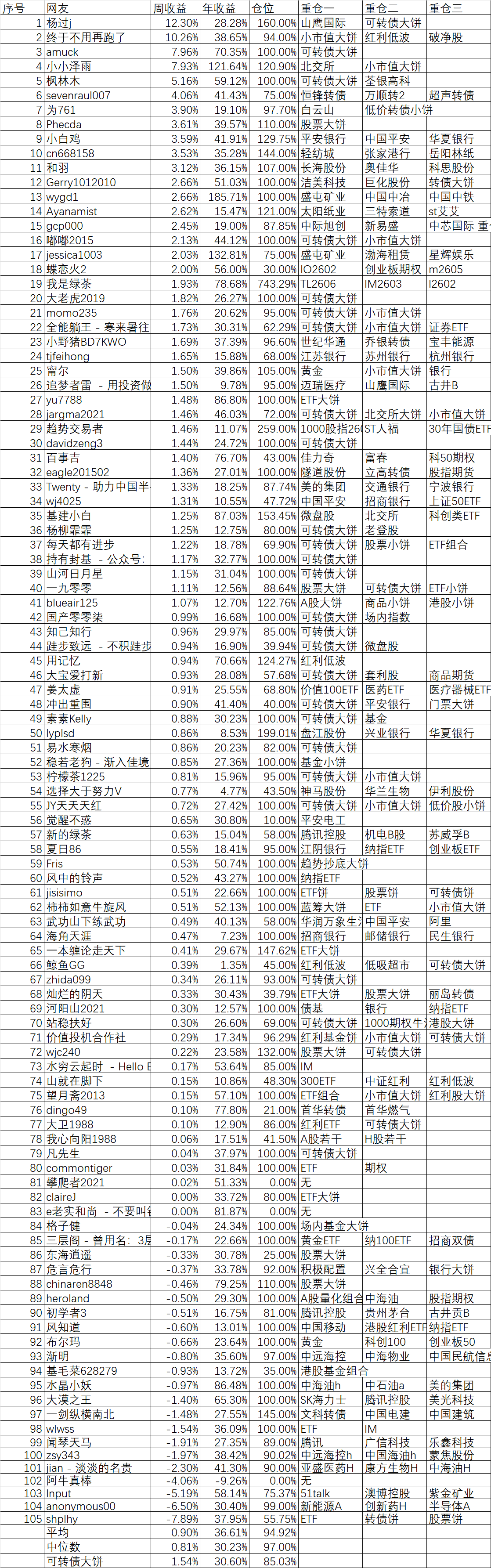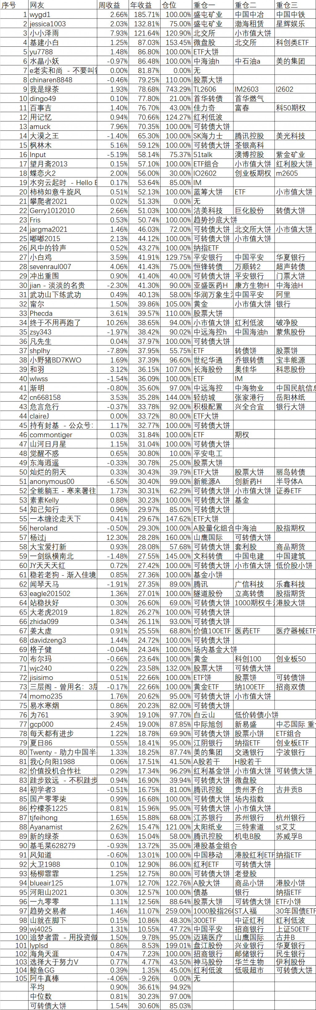 周收益 年收益 仓位 重仓一 重仓二 重仓三
