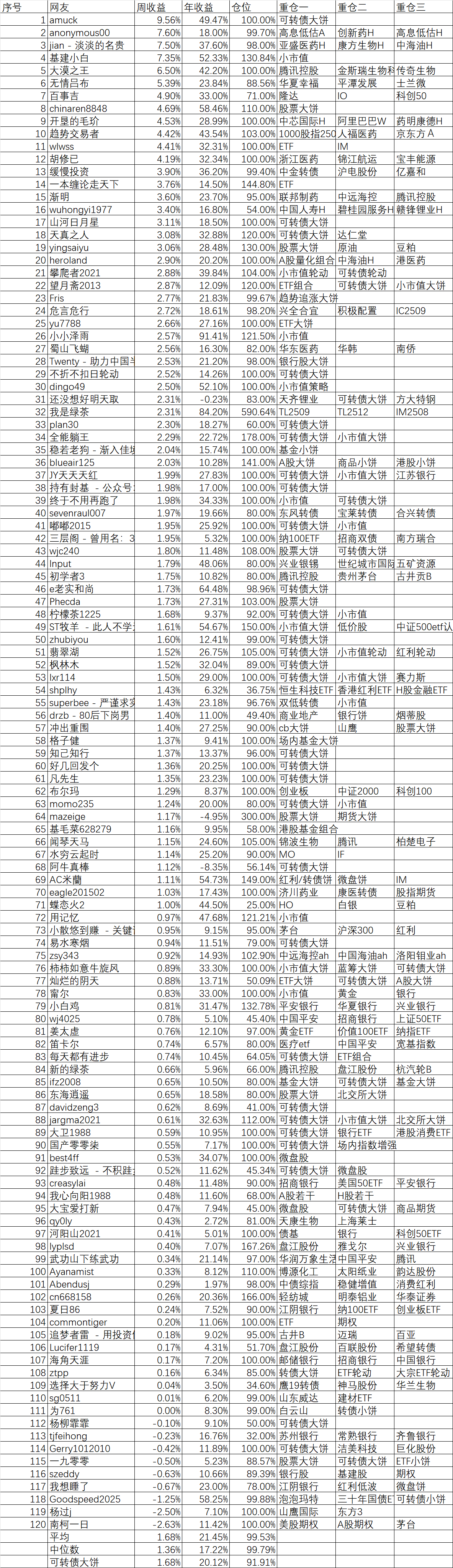 周收益 年收益 仓位 重仓一 重仓二 重仓三