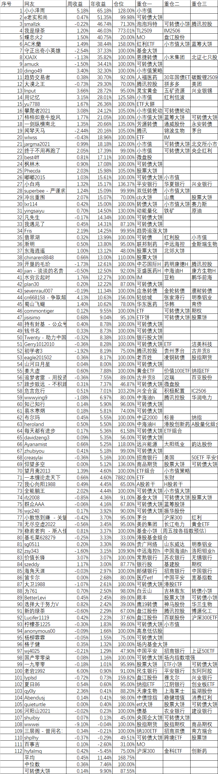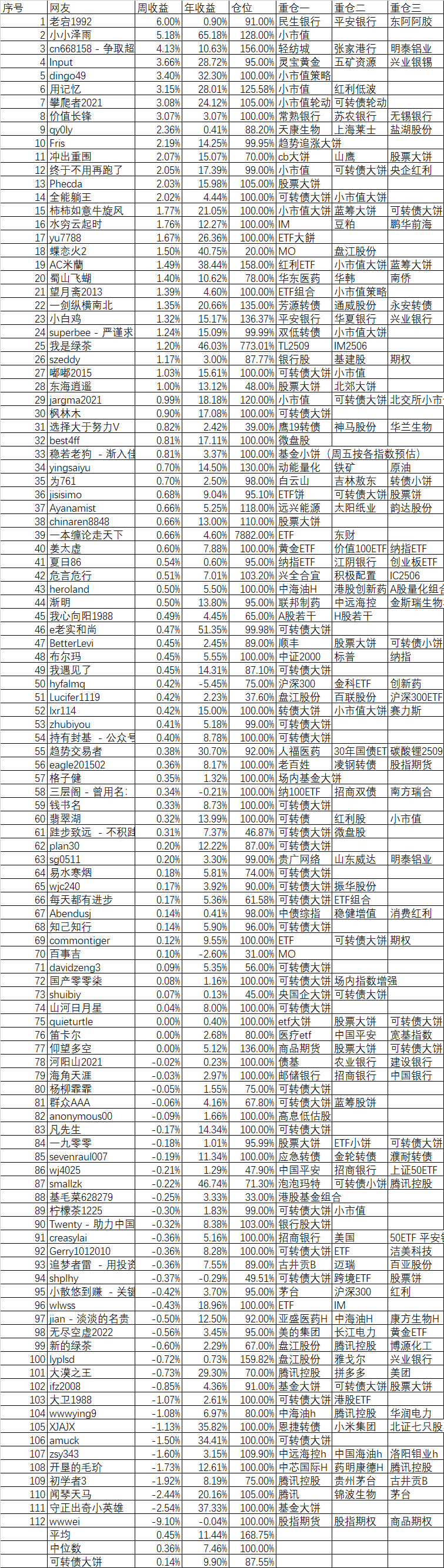 周收益 年收益 仓位 重仓一 重仓二 重仓三