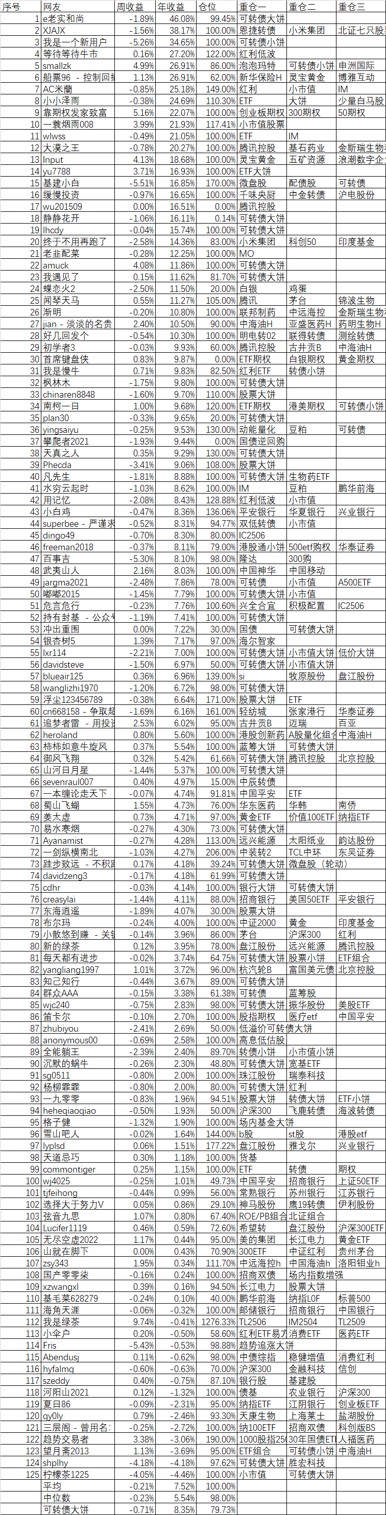 周收益 年收益 仓位 重仓一重仓二 重仓三