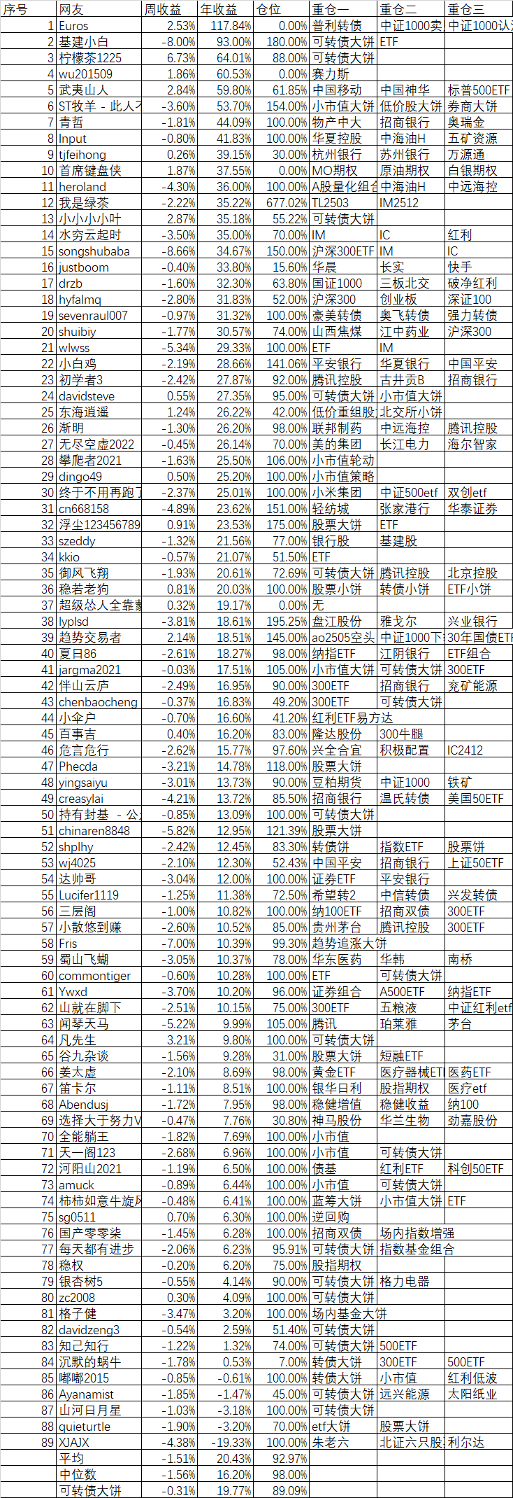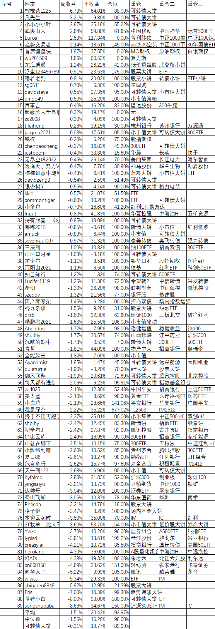 周收益 年收益 仓位 重仓一 重仓二 重仓三