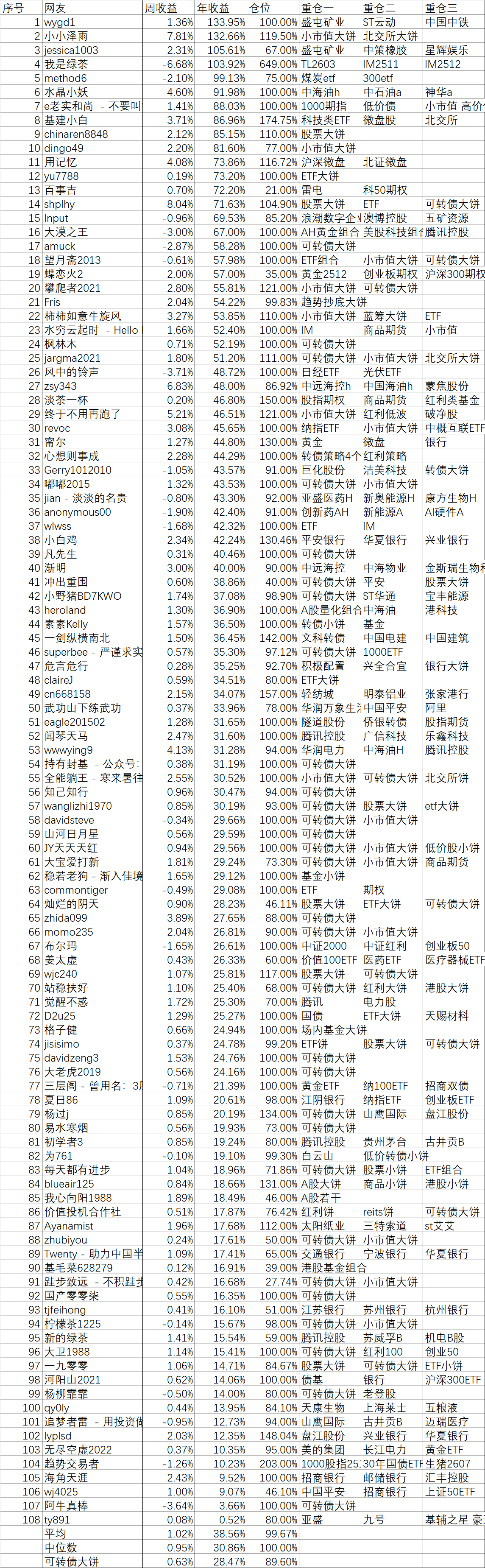 周收益 年收益 仓位 重仓一 重仓二 重仓三