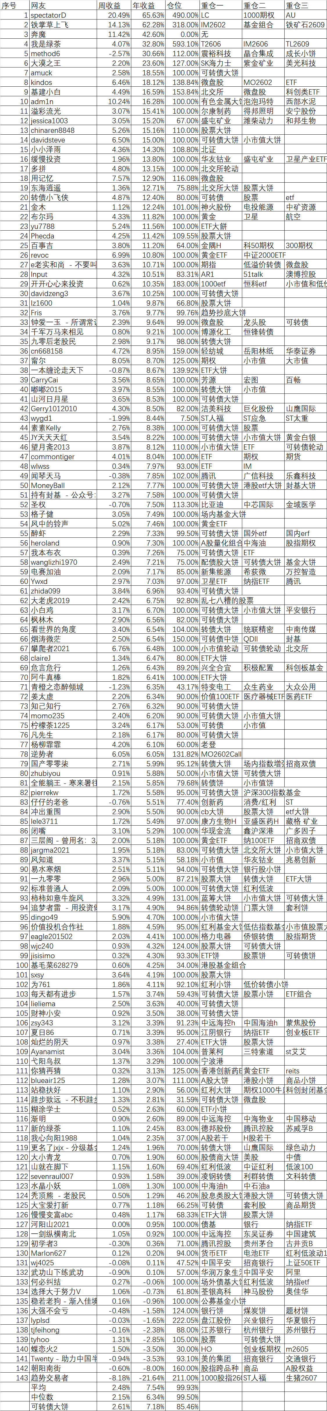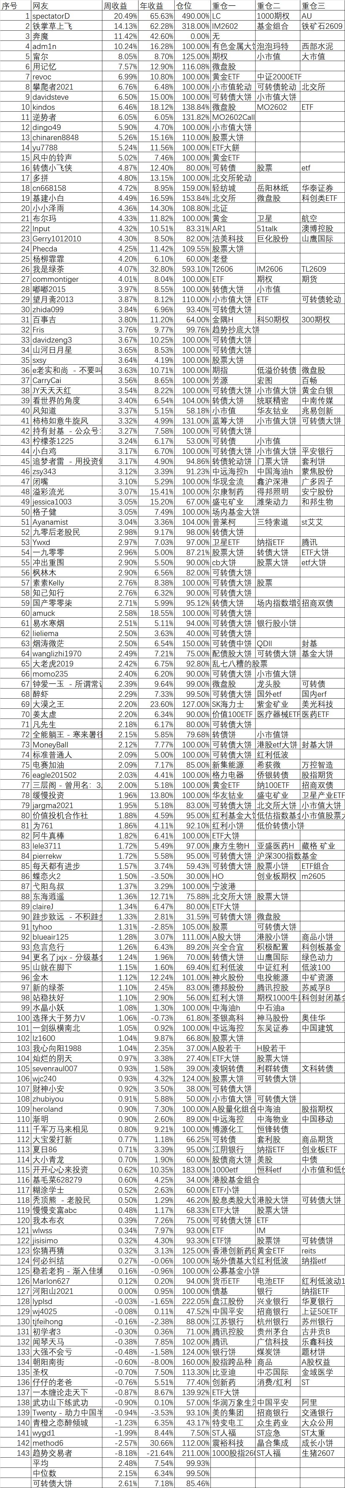 周收益 年收益 仓位 重仓一 重仓二 重仓三