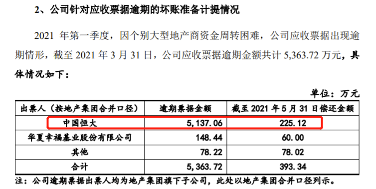 三棵树6月29日公布的2021年度非公开发行股票申请文件反馈意见的回复报告(修订稿)显示,2021年第一季度,因个别大型地产商资金周转困难,公司应收票据出现逾期情形,截至2021年3月31日,公司应收票据逾期金额共计5363.72万元,其中,中国恒大逾期票据金额5137.06万元,截至2021年5月31日偿还金额225.12万元;华夏幸福逾期票据金额148.44万元,截至2021年5月31日偿还金额60万元。