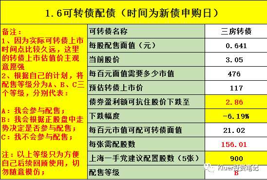 三房转债:正股三房巷,公司主要从事纺织、化工及热电三大业务板块。每百元含权21.02元,含权挺高。当前转股价值96.21元,发行规模25亿元,较大。拍脑袋给个117元的预估价(转股溢价率21.6%);证监会审批通过时间为22年11月23日晚,当天收盘价3.09元,最新收盘价3.05元。含权挺高的,又是上海的,我挺有兴趣的。虽然1手党理论上800股也可能能配到,但我建议还是买900股吧,因为本身就...