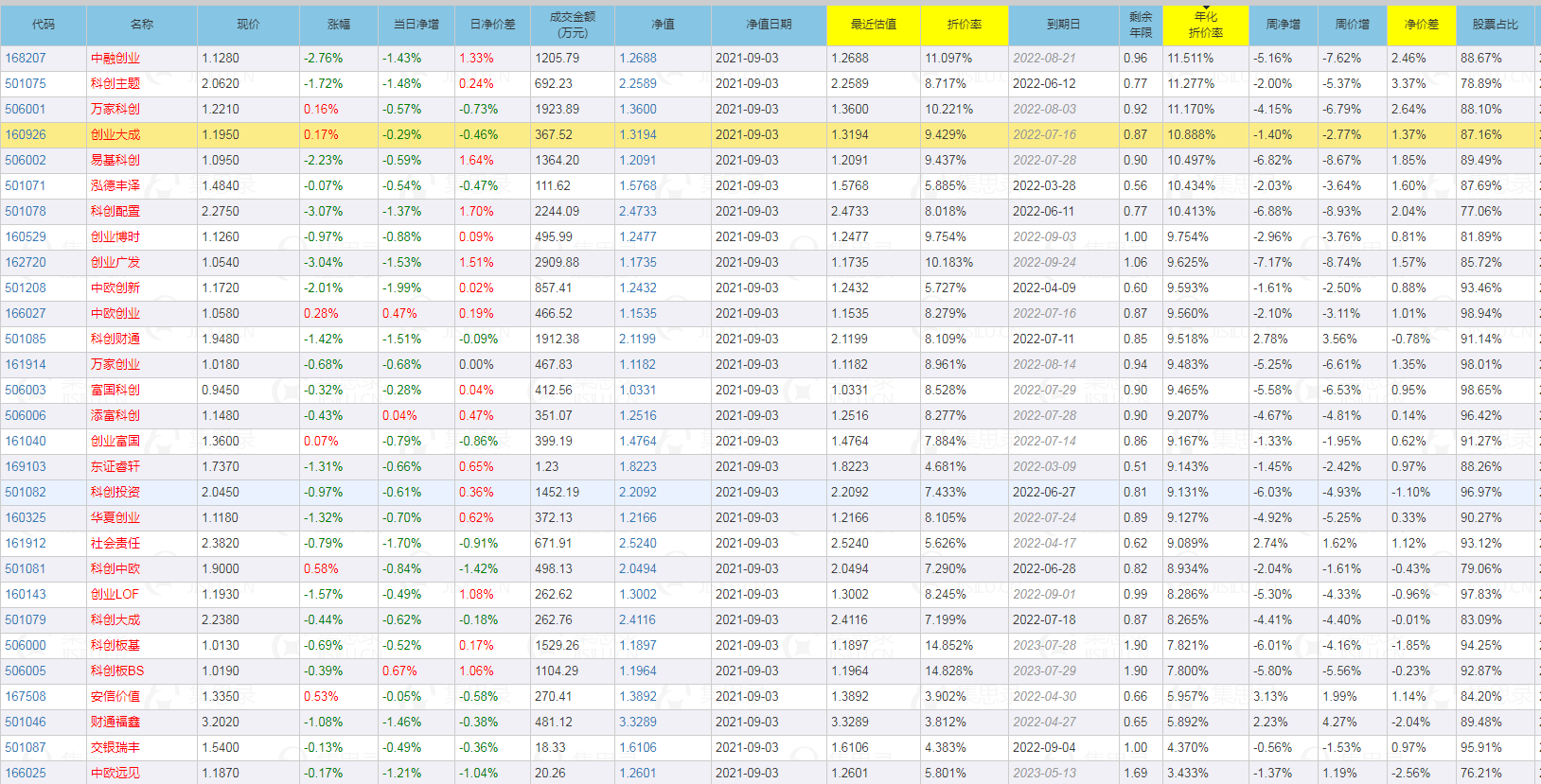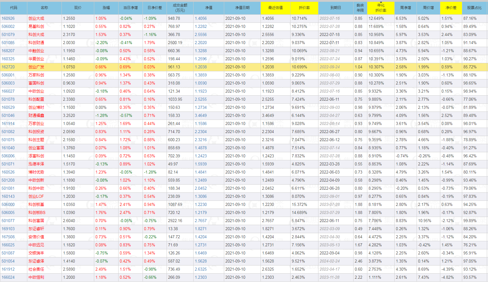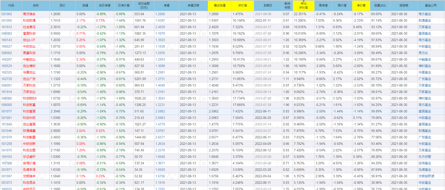 2021年8月14号,每周会不定期选择一些好的封闭基金与大家共享,我们知道,老封闭基金有三条腿,净值增长,折价和分红,而现在的封闭基金只有净值和折价两条腿了,而这两条腿中,净值增长为王,每周每月的净值增长最好的,就是所有封闭基金中那只最亮的仔,净值增长了,相应价格也会增长,而随着热度的增高,相应的折价率也会缩小,也就是所谓的价格增长大于净值增长,反之,就会出现价格增长小于净值增长。所以我们就应该挑选每周每月之中那些净值增长率相对高的品种,这样我们就会获得超过净值增长的超额收益。下面我把这周挑选出的一些好的封闭基金,望大家共勉。