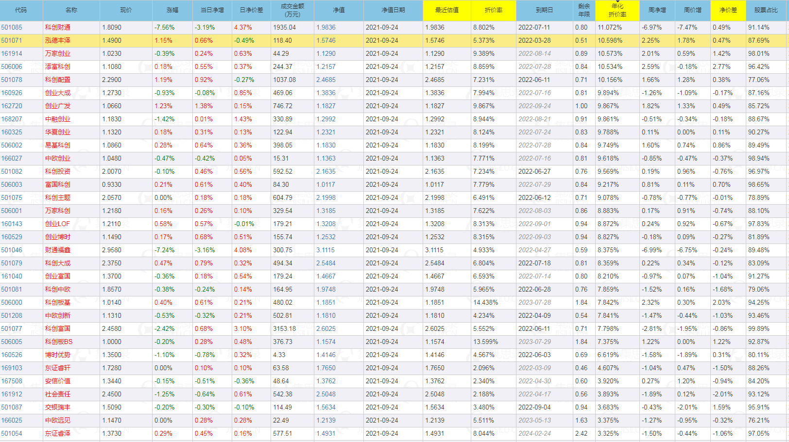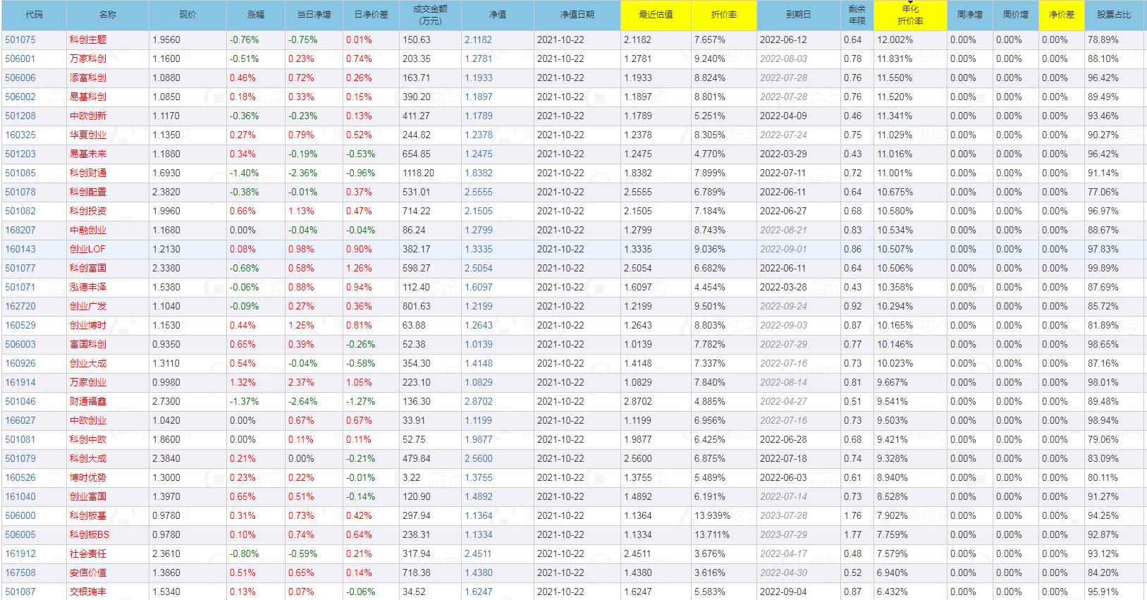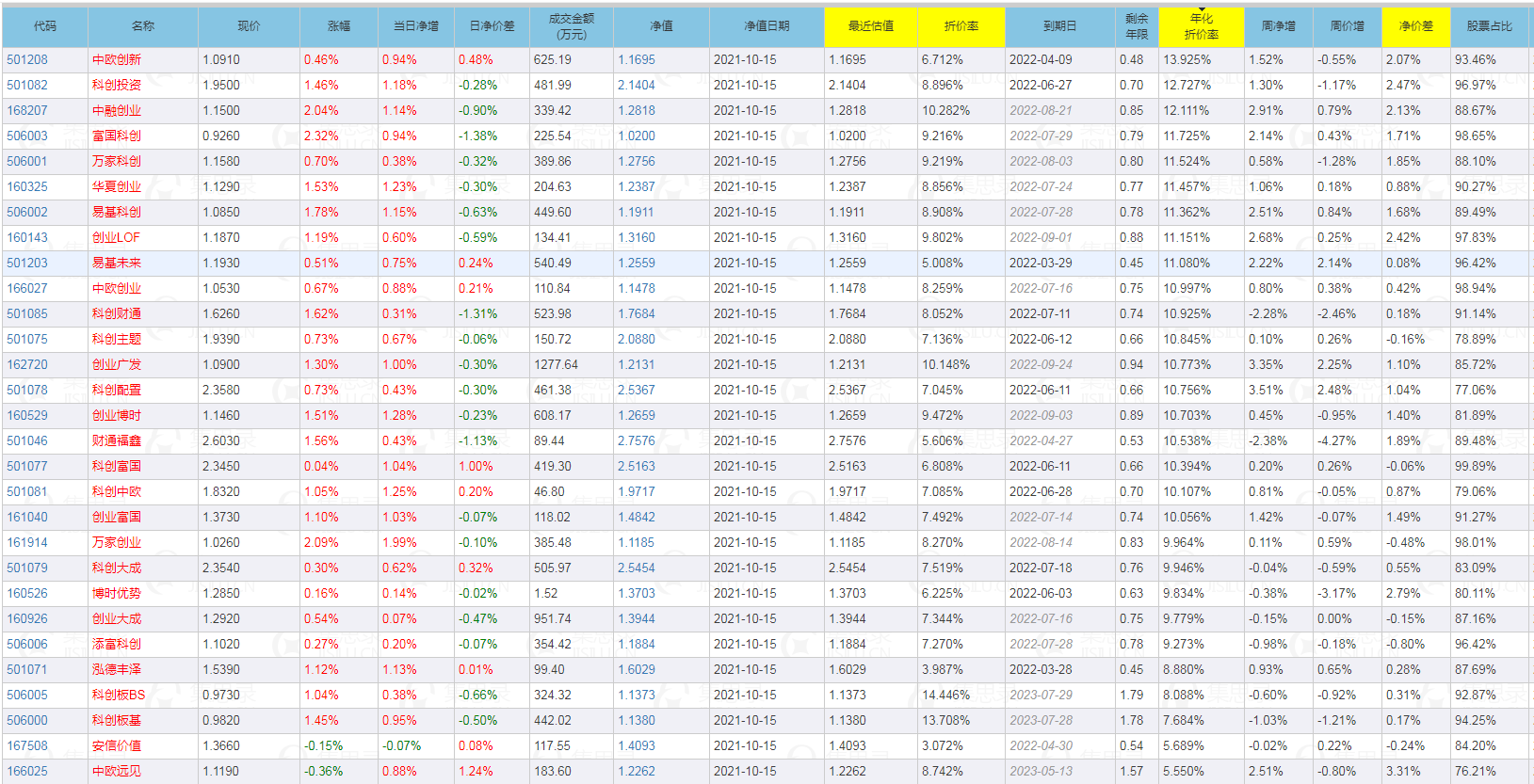 2021年8月14号,每周会不定期选择一些好的封闭基金与大家共享,我们知道,老封闭基金有三条腿,净值增长,折价和分红,而现在的封闭基金只有净值和折价两条腿了,而这两条腿中,净值增长为王,每周每月的净值增长最好的,就是所有封闭基金中那只最亮的仔,净值增长了,相应价格也会增长,而随着热度的增高,相应的折价率也会缩小,也就是所谓的价格增长大于净值增长,反之,就会出现价格增长小于净值增长。所以我们就应该挑选每周每月之中那些净值增长率相对高的品种,这样我们就会获得超过净值增长的超额收益。下面我把这周挑选出的一些好的封闭基金,望大家共勉。