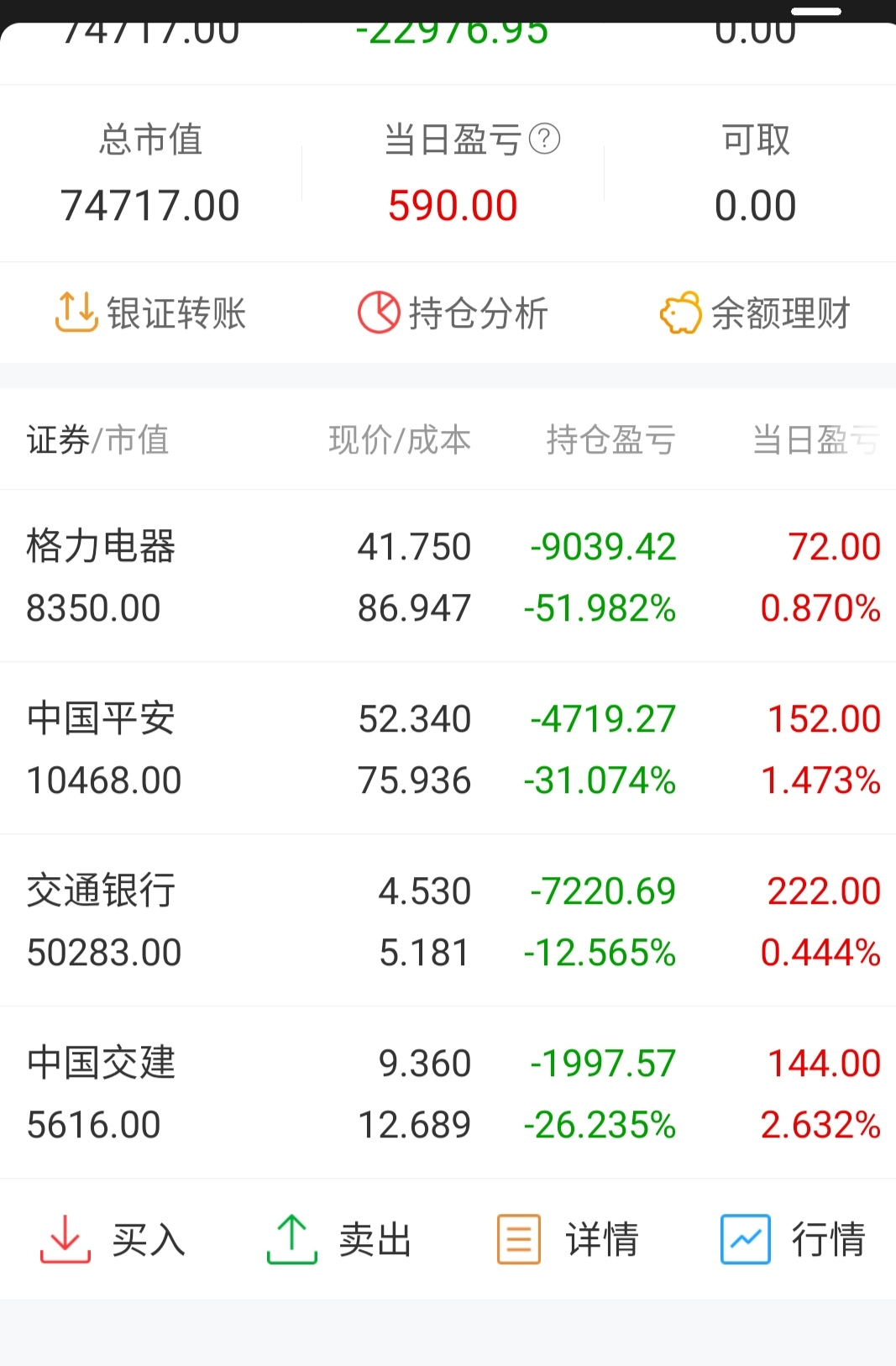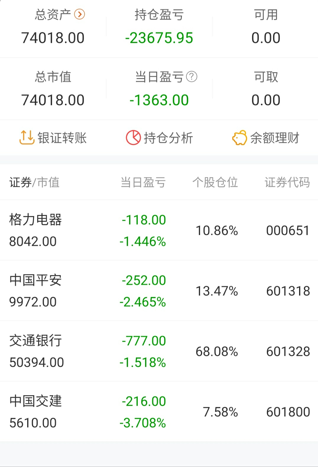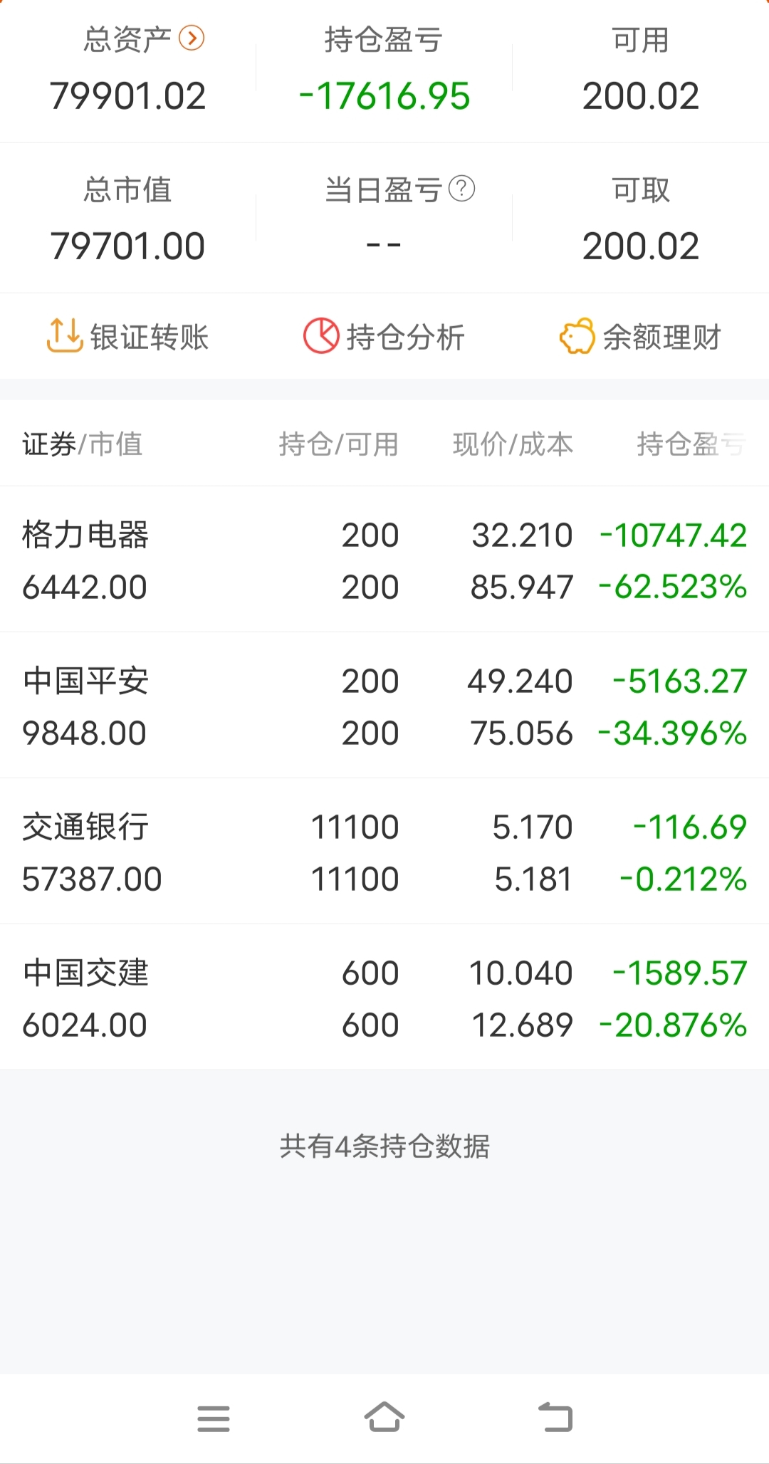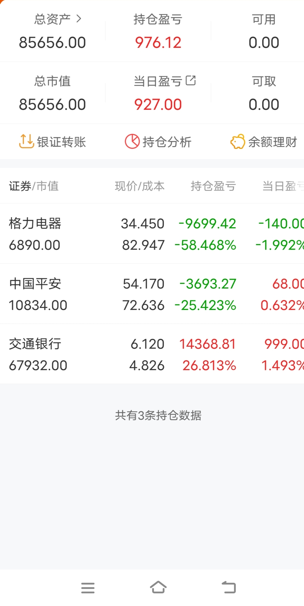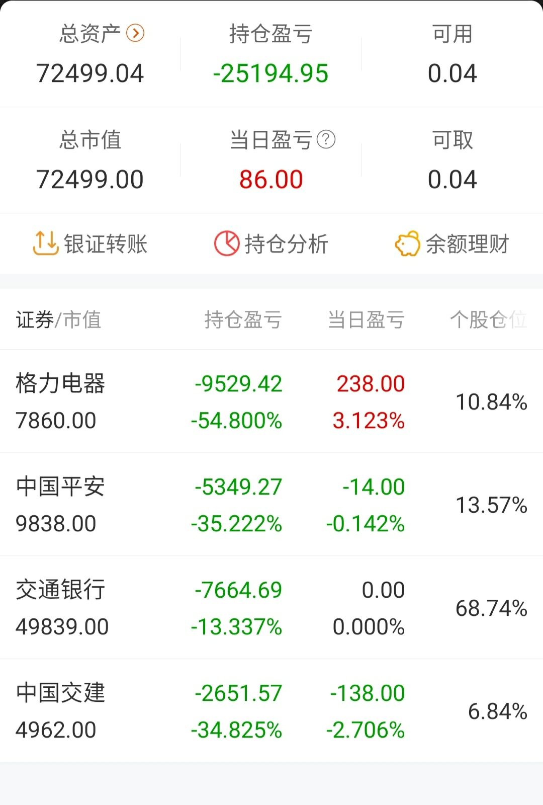 平安、格力是去年1月买的,平安最初八十二三买的,通过做T和减仓,到现在的成本。