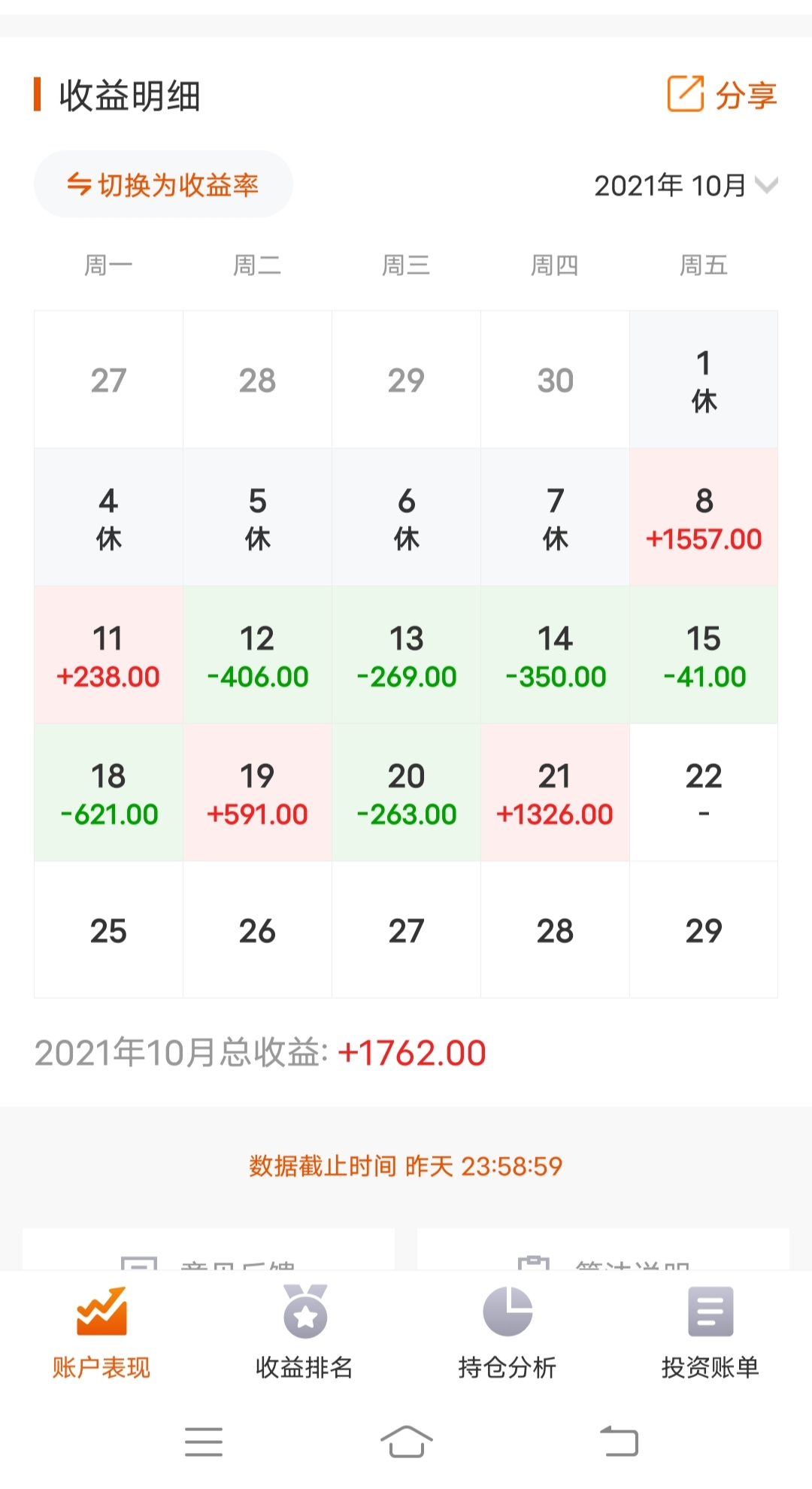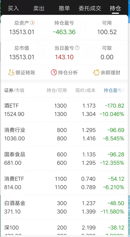 现在大致能控制情绪,不会在暴跌的情况下大幅割肉,但是却没法控制好加减仓节奏。比如昨天暴跌的时候想加仓,早已经没钱了,只能眼睁睁看着指数大幅拉回来。每次刚开始跌就加满仓了,等跌到底的时候反而没钱加仓了,不知道什么时候能踏准节奏,那样收益肯定能比现在大幅提升。以后控制自己,下跌第三天才出手加仓试试。