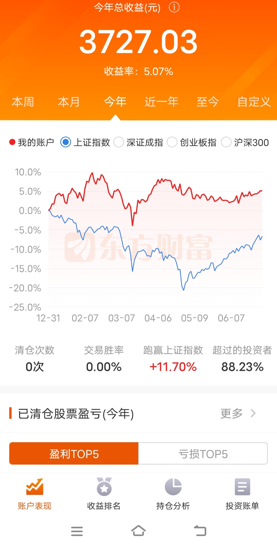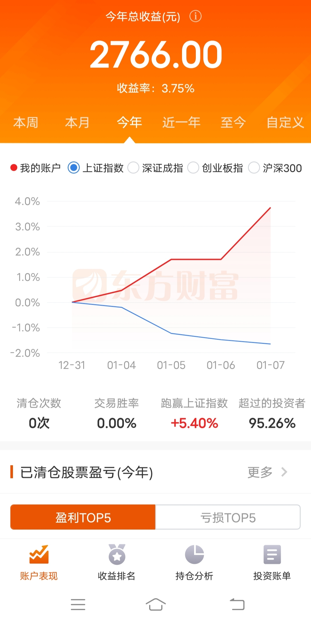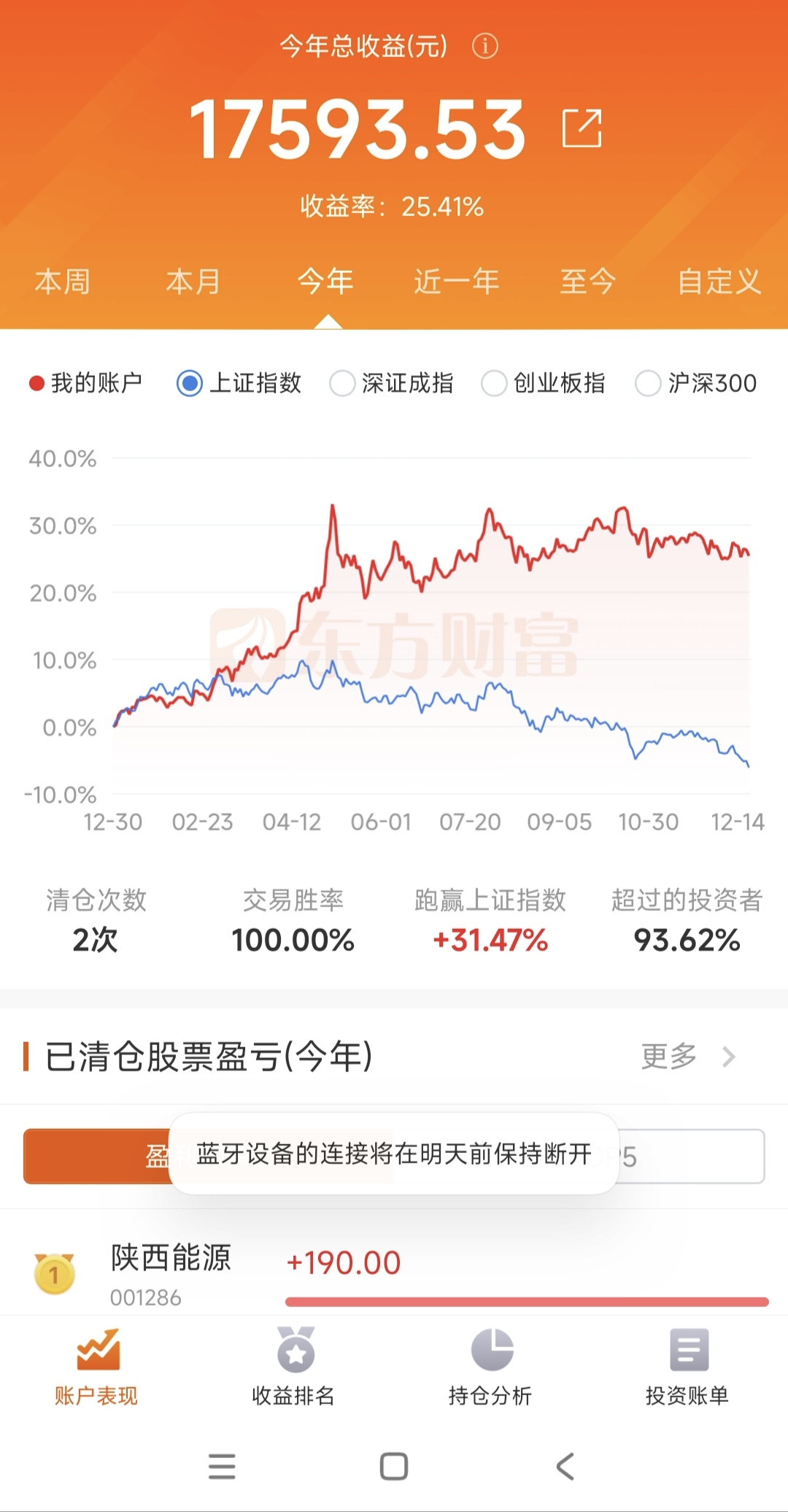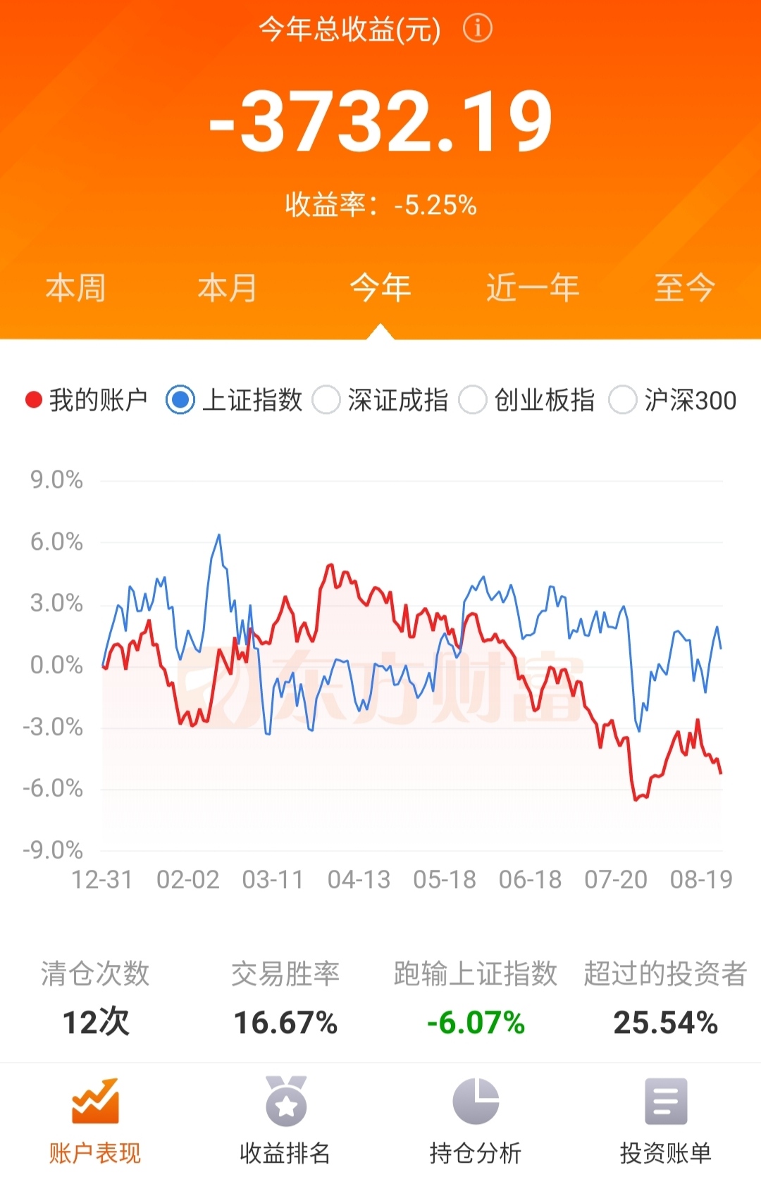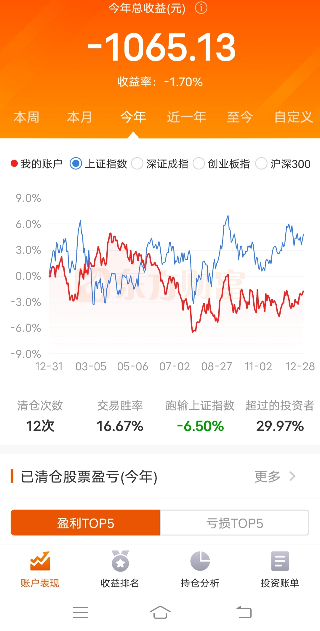 看看今年貌似也没亏多少,主要受益于一只去年买入的票,今年翻倍了,是的我竟然买入了一个几个月就翻倍的票,而我前几天才知道,知道后就把它卖了,我不允许翻倍票出现在我的账户里。虽然翻倍了,但是我还是亏了七八个点,去年28买的,今年最低11.1,亏损达60%多,前几天26卖的。