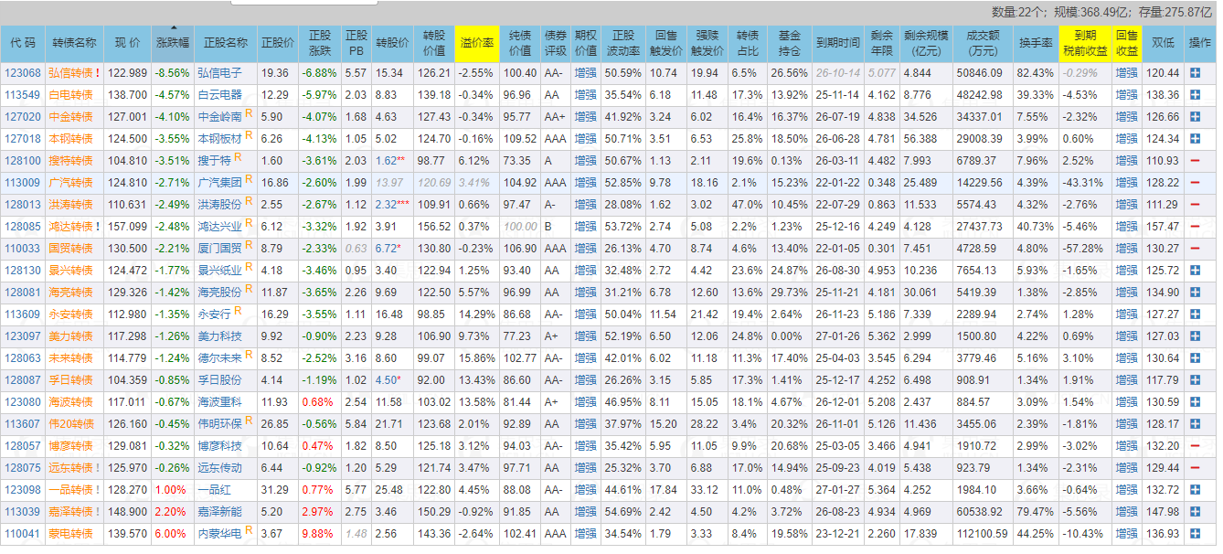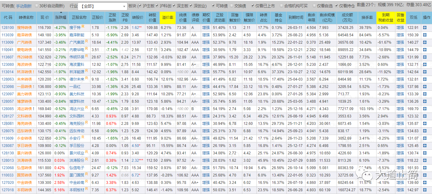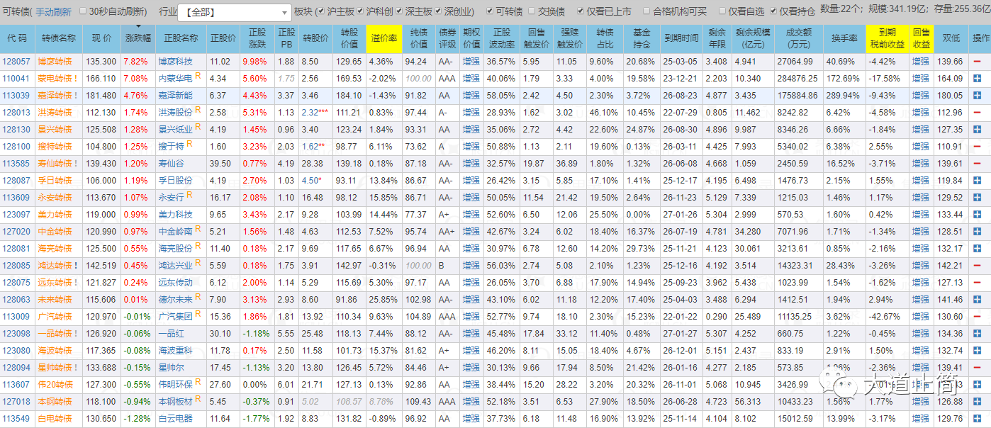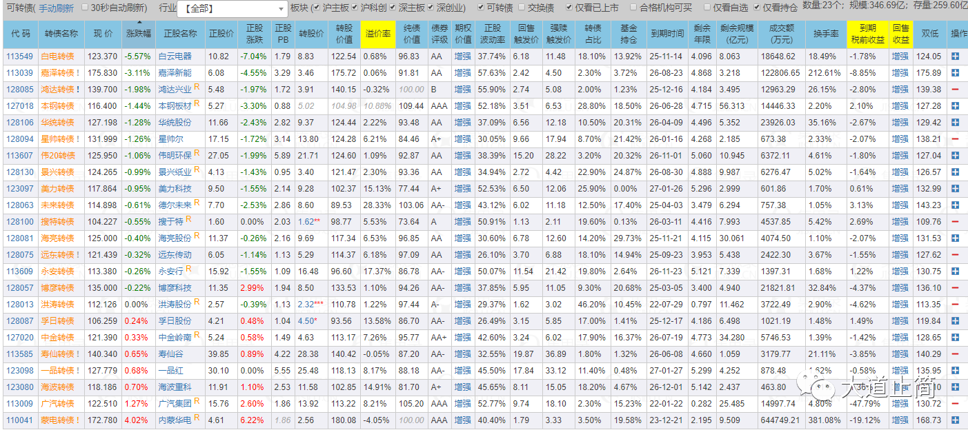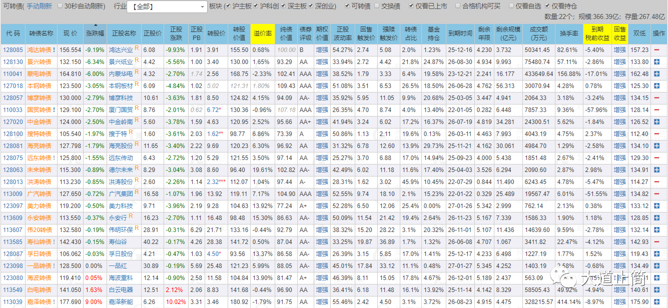今天翻红的只有三支票(嘉泽、白电、海波),一品转债平收,其他18只票全部收跌,鸿达转债、景兴转债、蒙电转债这三个跌幅更是超过了5%,二者三只转债恰恰是昨天表现最好的三只!这初一十五的轮换也太快了吧!
