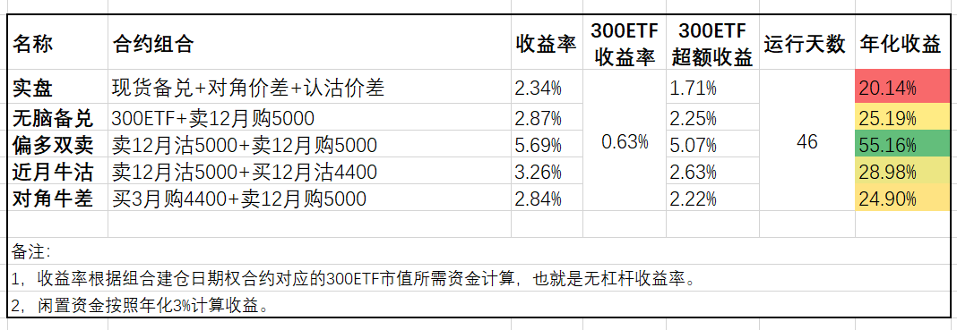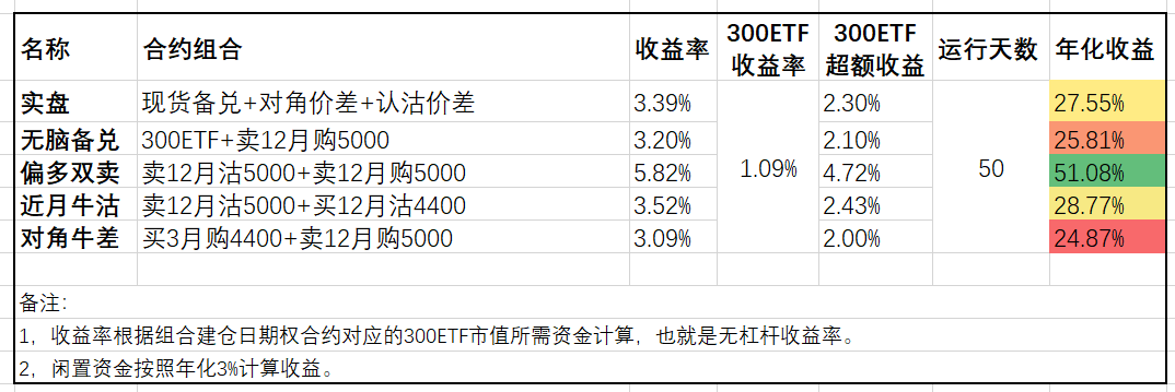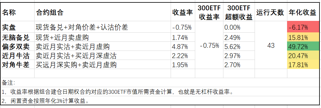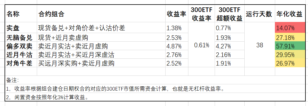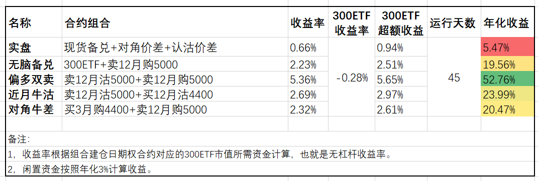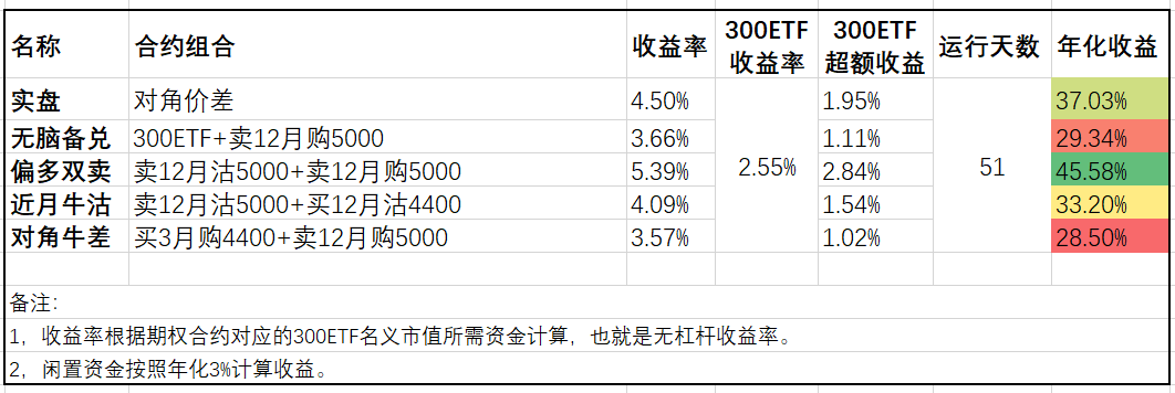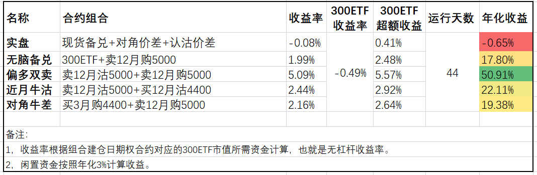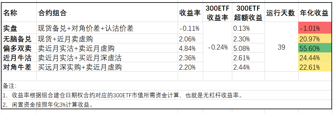 模拟盘方面,下跌的日子可以看到对角牛差相对备兑又展现出更抗跌的优势,而近月牛沽虽然当月组合已经浮亏,但由于上个月的盈利积累目前依然领先。