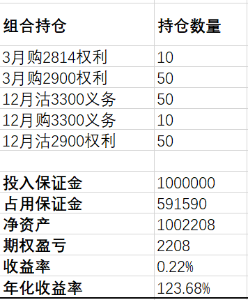 最终组合是买3月2900加卖12月3357,组合vega正好为0。