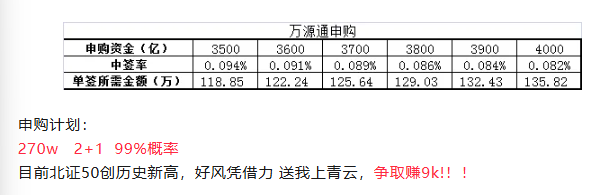 预测万源通申购资金3800亿正负100亿,实际3675亿;综合各种因素,这次预测胜业电气申购资金3700亿正负100亿。220万可中 1 + 1 。如果预测与实际相差悬殊,概不赔偿资金利息!这次应该低于3675亿。