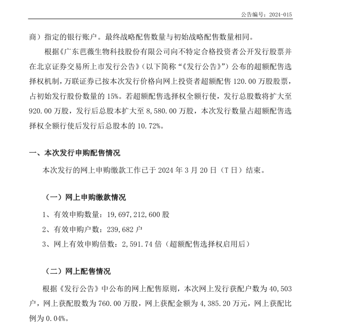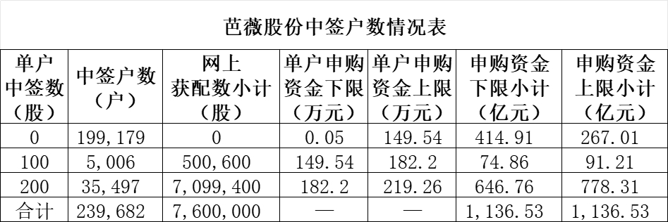 芭薇股份网上发行获配户数为 40,503户,其中获配200股35,497户、100股5,006户、0股199,179户,对应资金上限778.31亿元、91.21亿元、267.01亿元,合计1,136.53亿元。其中获配200股35,497户、100股5,006户、0股199,179户,对应资金上限778.31亿元、91.21亿元、267.01亿元
