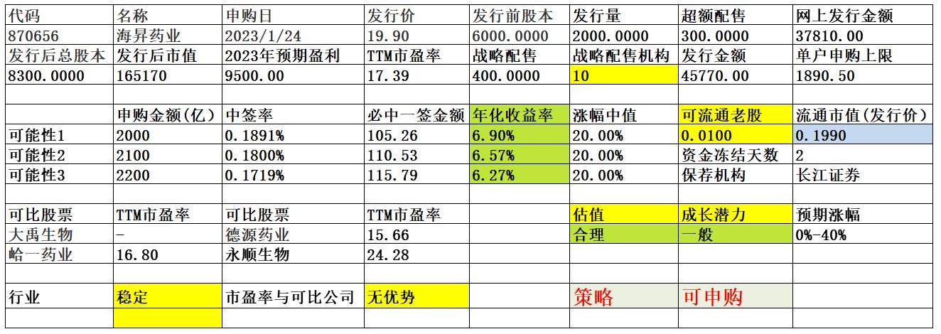 海昇药业公司主要从事兽药原料药、医药原料药及中间体的研发、生产和销售。公司自设立以来,逐步成长为以抗微生物和抗寄生虫为核心的兽药原料药、以解热镇痛和抗菌为核心的医药原料药的生产企业,形成了兽药原料药和医药原料药同步发展的优势。公司所处行业稳步增长,公司成长性一般,发行市盈率与可比公司相比无优势,无流通老股,绝对发行价较高,2023年业绩下滑。可申购。本次单户申购上限较高,预计申购总金额2000-...这涨幅有点低啊,质地太差了