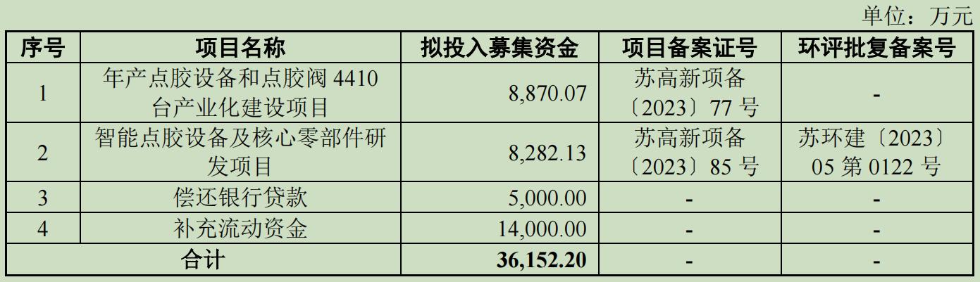 招股书显示,公司拟IPO募资约3.6亿元,用于年产点胶设备和点胶阀4410台产业化建设项目、智能点胶设备及核心零部件研发项目、偿还银行贷款、补充流动资金。