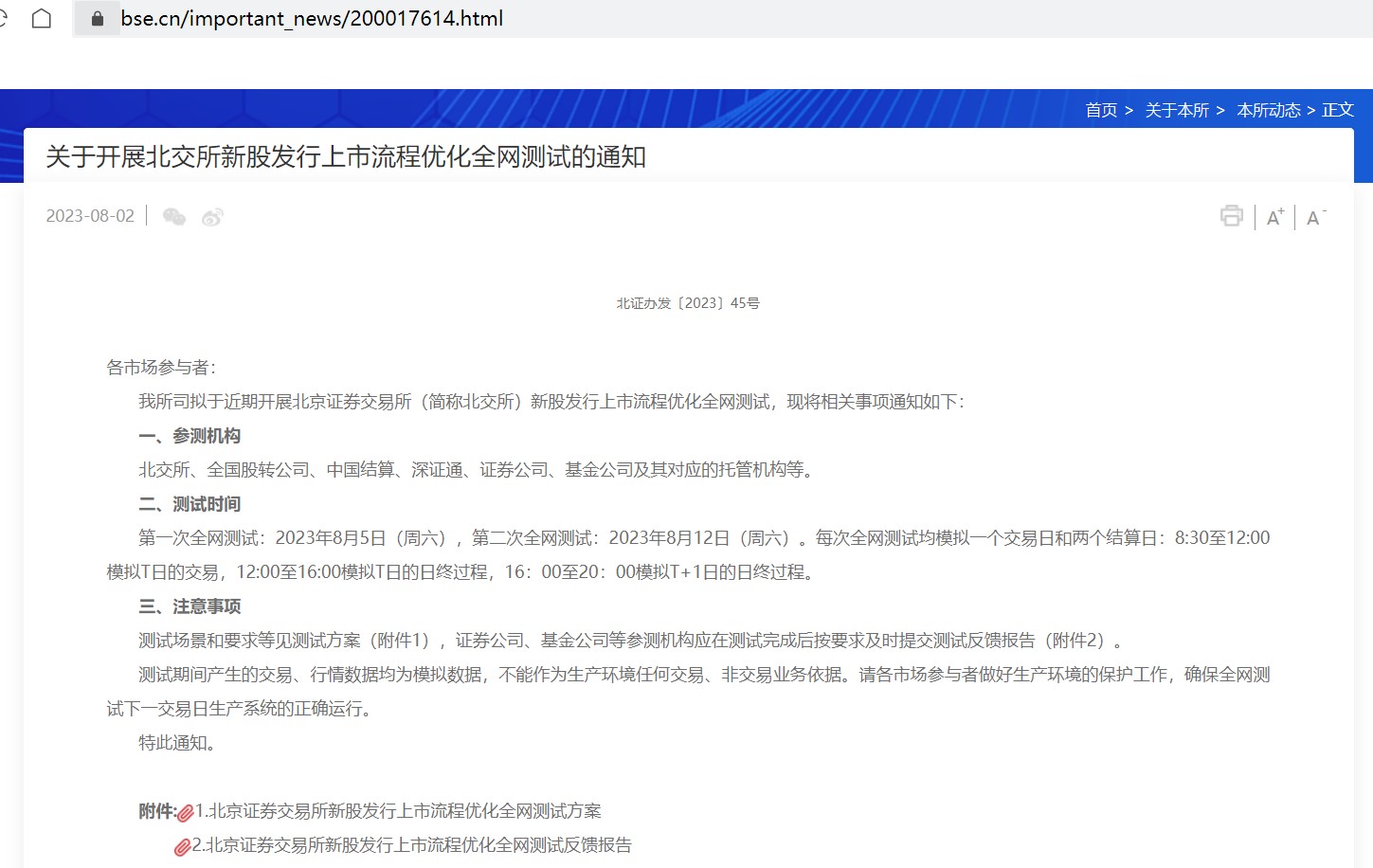 近期开展北京证券交易所新股发行上市流程优化全网测试。