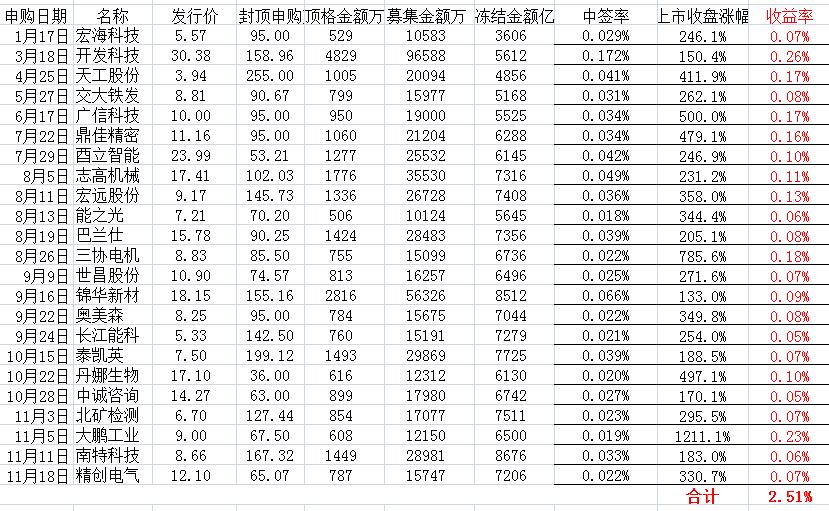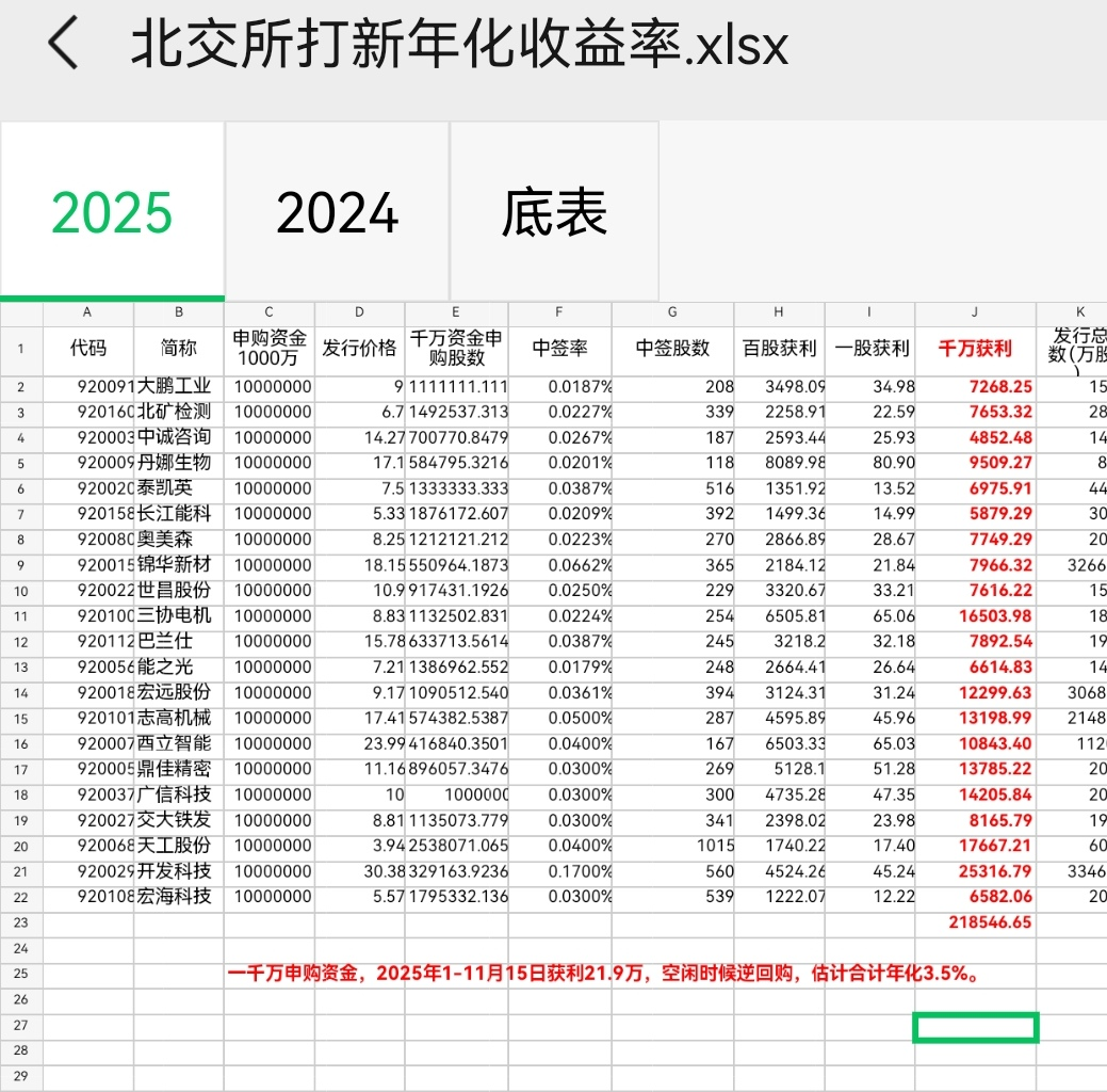 不过他说北交打新今年能有8-9%,我们算一下,今年新股发行23只,假设一只占用2.5天,共占用57.5天,则空闲资金按照逆回购收益1.5%*(365-57.5)/365=1.26%