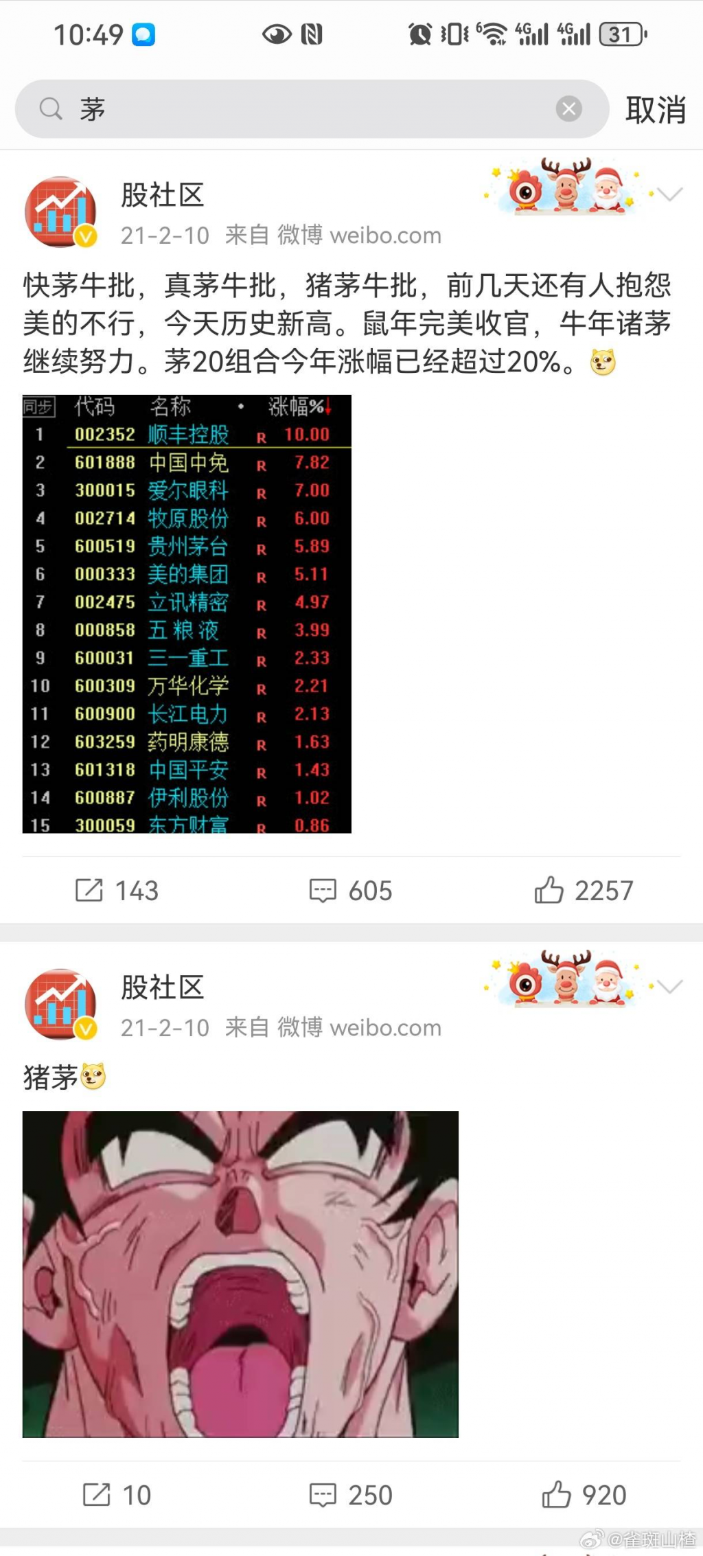 这种所谓水货大V前几年就取关拉黑了,开始看了一段时间,每天整理一下新闻挺好的。当年应该是2021年初吹嘘茅20,当时我买的钢铁,我记得很清楚当时包钢1.1左右开始反弹,有一天钢铁大涨他评论区第一条置顶嗤笑说这些是茅坑里的石头长久不了,只有茅20才有机会。哪会就果断拉黑了道不同不相为谋。后来大家也看到了,包钢涨到了4快多,茅20腰斩再腰斩。听他买茅20的粉丝惨死。最讨厌这种所谓的造神运动,当年还做...这图我一直留着:D