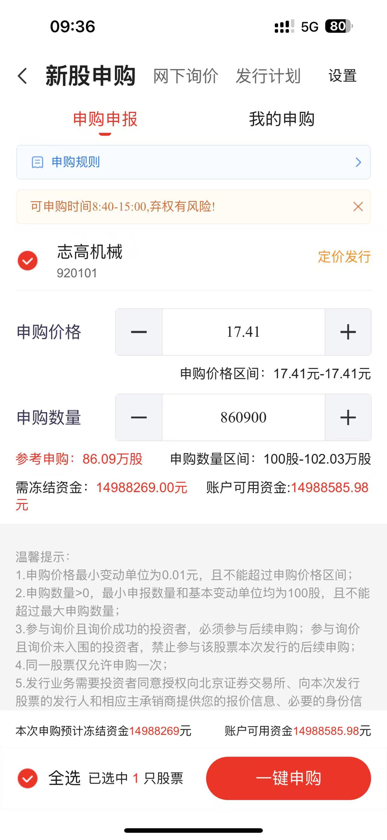 被自己蠢哭了,申购322000,结果少输了个0,撤单又撤不了,想换老婆账号继续申购,结果老婆账号限额,等一通折腾解除限额,时间已经过了15点了。这么多人少打一个0的呀,害得我打开账户又数了一下。