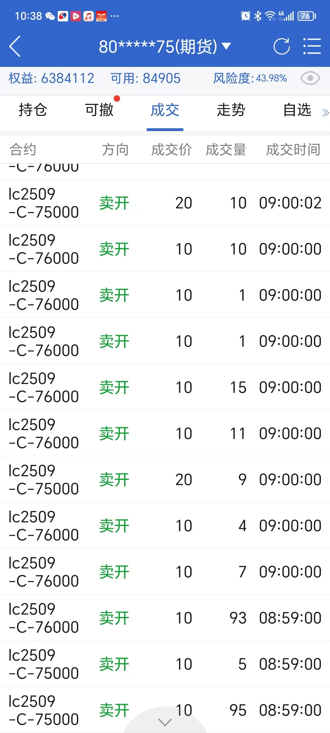 没有翻车,为稳妥起见,上午20和10成交的购75000的200手全部平今,小赚100,之后挂78000,目前持有购76000五佰手,7700三百手,78000二百手,尾盘掉波太快,还有几百手卖7300没成,这种极端行情其实只要调到安全仓位就行了,因为到期日,又在涨停板之外,调仓不难