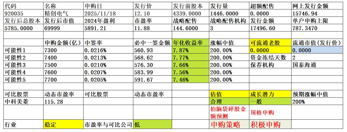 申购建议:公司所处行业稳定,公司质地尚可,发行市盈率与可比公司相比具有一定优势。无流通老股。本次单户申购上限787万元,预计申购资金在7500亿元左右,拍脑袋碎股金额需要顶格。