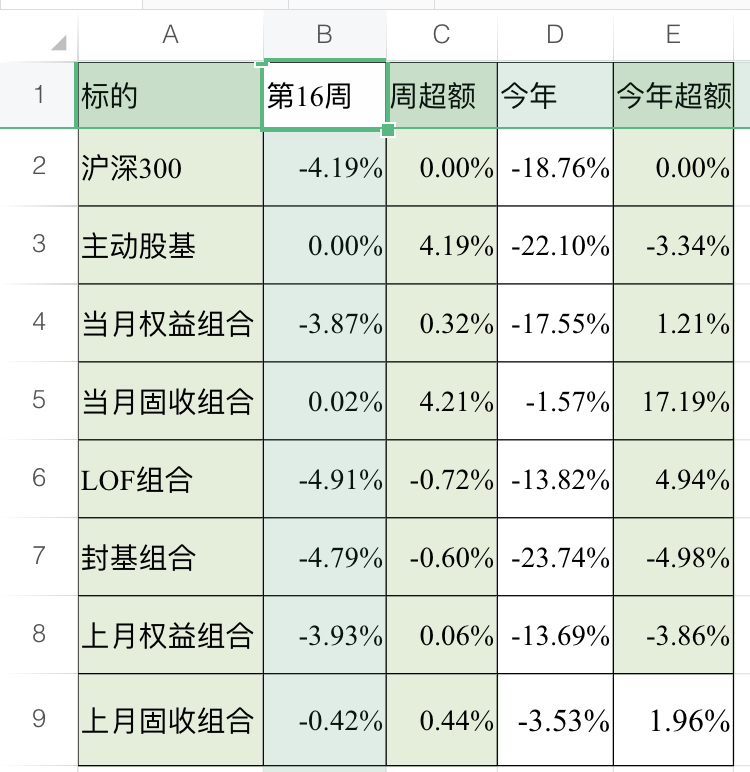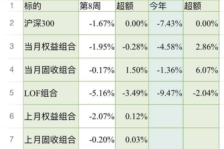 这周组合跑输沪深,基本上是跟跌积极,跟涨乏力。