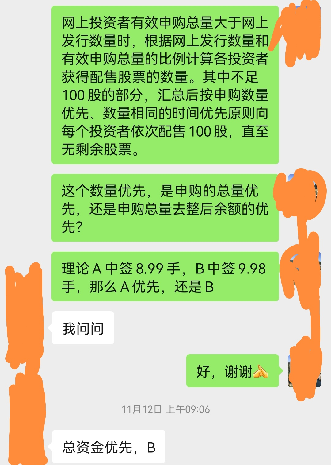 - 目前看来就算北交所的人也不一定理解正确规则,因为资金优先和余股优先都解释得通,正确结果要看星期一公告了。既然您这样说了,我相信你,因为网络上胡说八道的太多了,言语不妥之处望见谅,好吧,不讨论了,再次向您道歉!