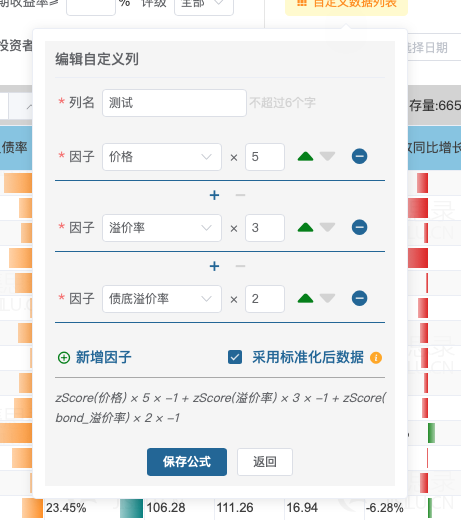 随意定义了一个,zScore(价格) × 5 × -1 + zScore(溢价率) × 3 × -1 + zScore(bond_溢价率) × 2 × -1,终于能显示出来了,不过chrome里里只显示名称代码和自定义列了,EDGE里还是不显示自定义参数