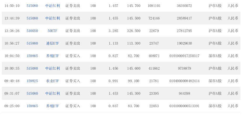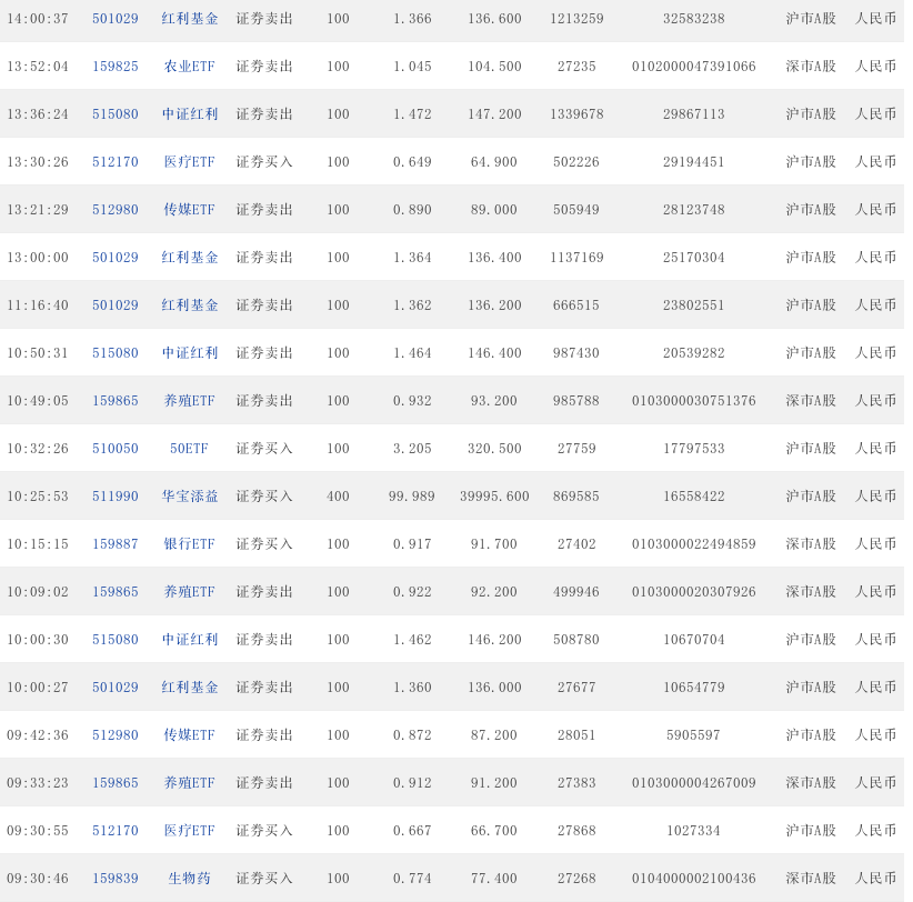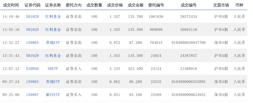 09:32:25 159865 养殖ETF 证券买入 100 0.924 92.400 21064 0102000003677181 深市A股 人民币