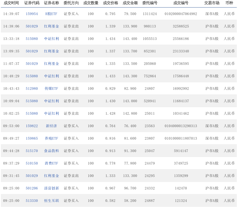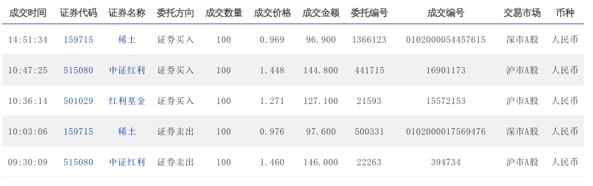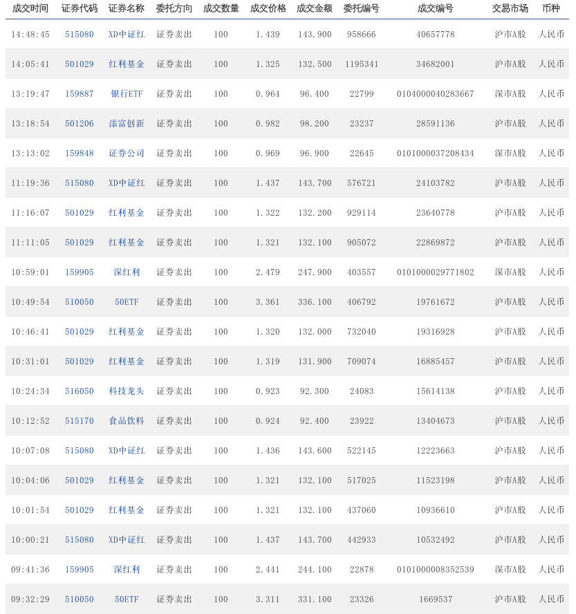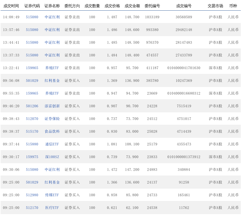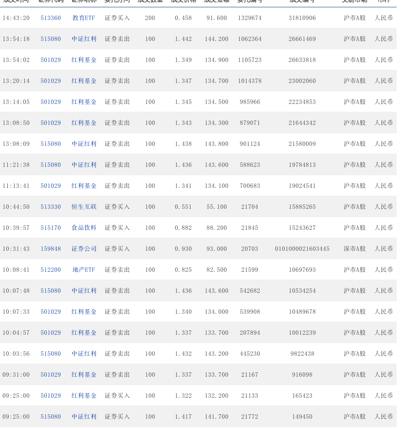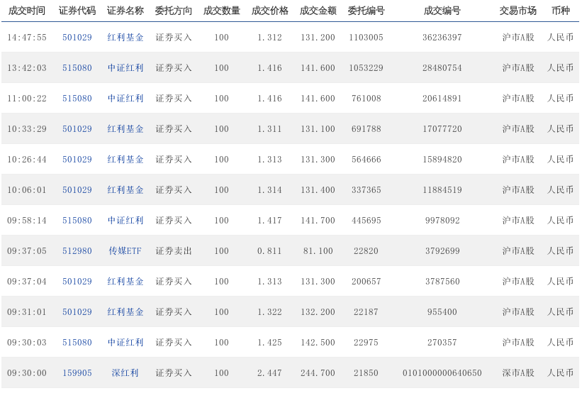 14:31:46 515080 中证红利 证券买入 100 1.405 140.5 927307
