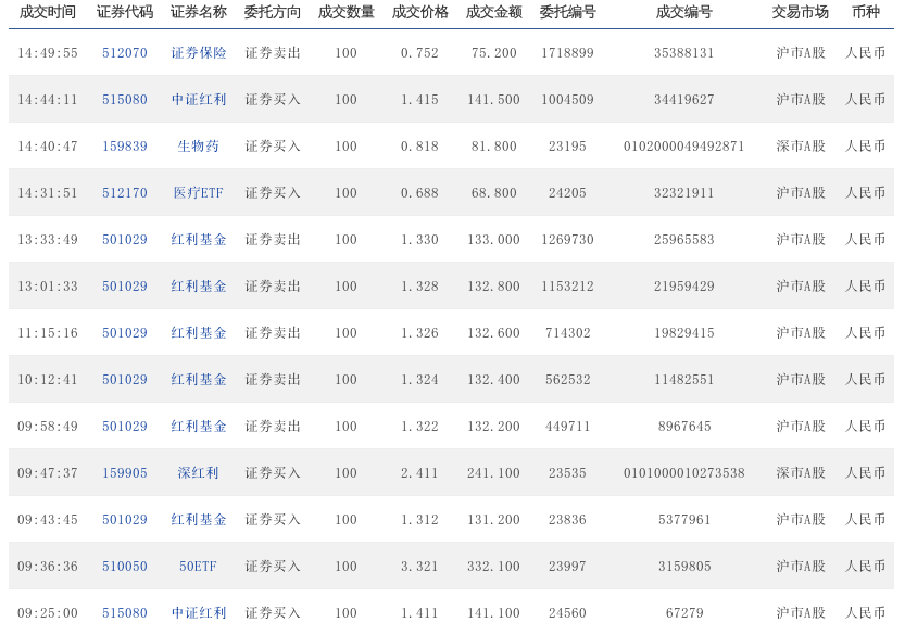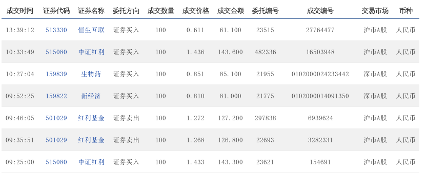 9:40:05 515080 中证红利 证券买入 100 1.402 140.2 169122