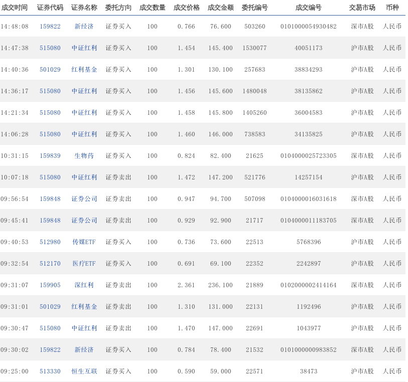 09:32:13 159822 新经济 证券买入 100 0.725 72.500 20826 0103000003252923 深市A股 人民币