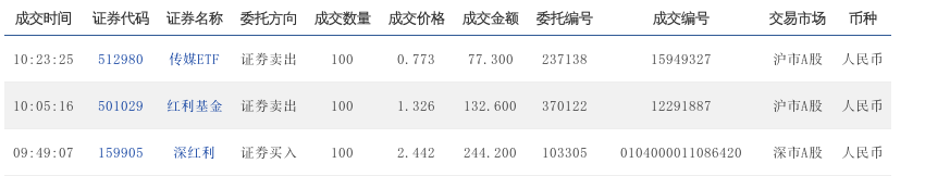 10:25:36 159905 深红利 证券买入 100 2.403 240.300 21198 0103000023479010 深市A股 人民币