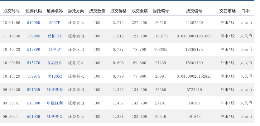 09:44:34 510050 50ETF 证券买入 100 3.210 321.000 21571 5807815 沪市A股 人民币