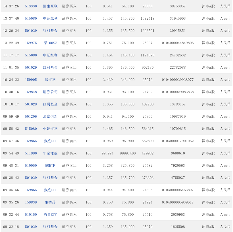 10:20:19 501029 红利基金 证券买入 100 1.356 135.600 500542 13723768 沪市A股 人民币