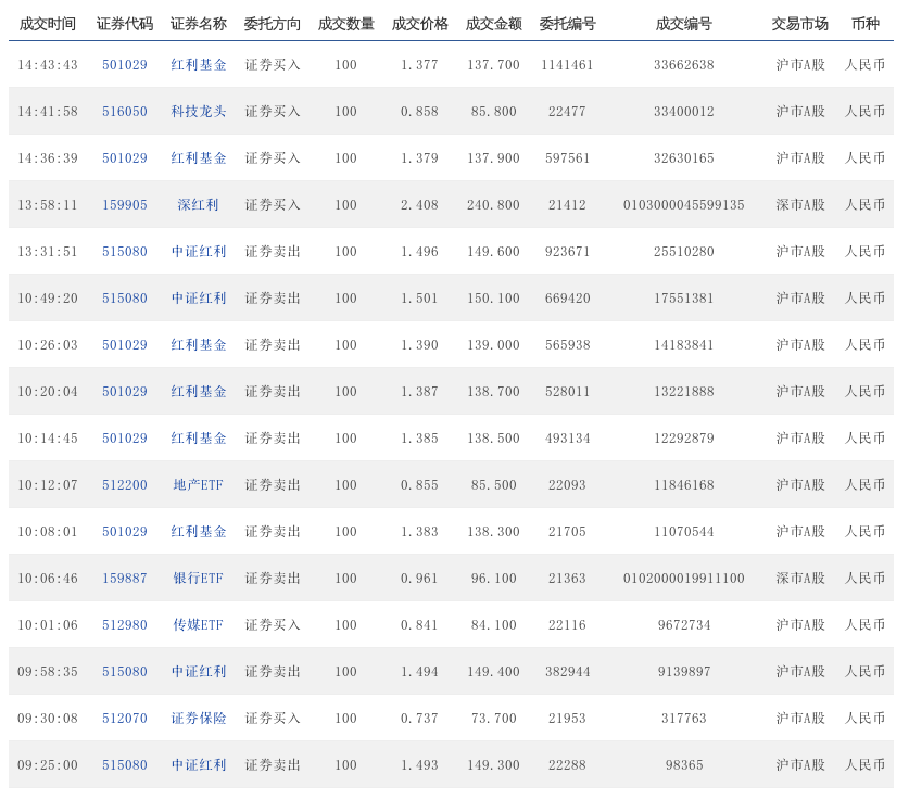9:34:13 515080 中证红利 证券买入 100 1.413 141.3 112068