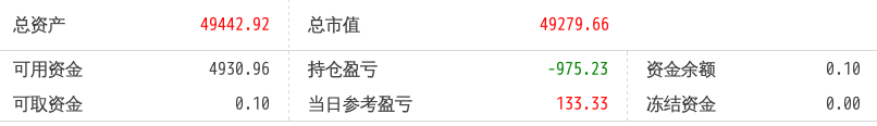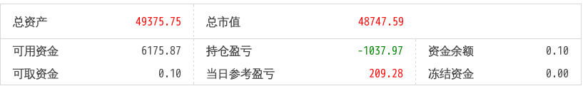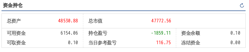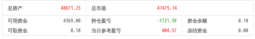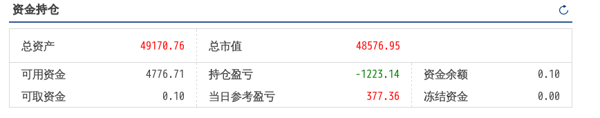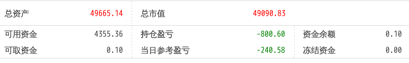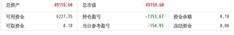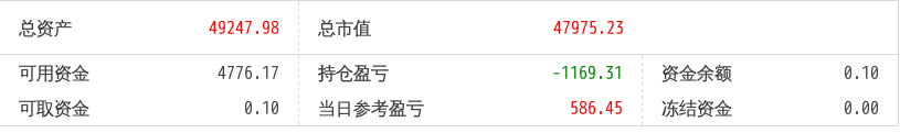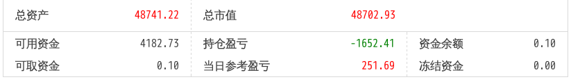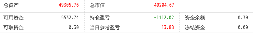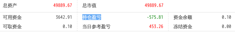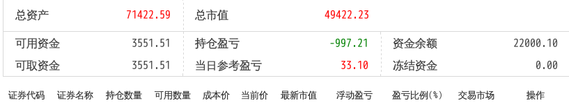 220516总资产89719.90 总市值89719.90 可用资金1803.61 持仓盈亏-6243.18 当日参考盈亏454.90
